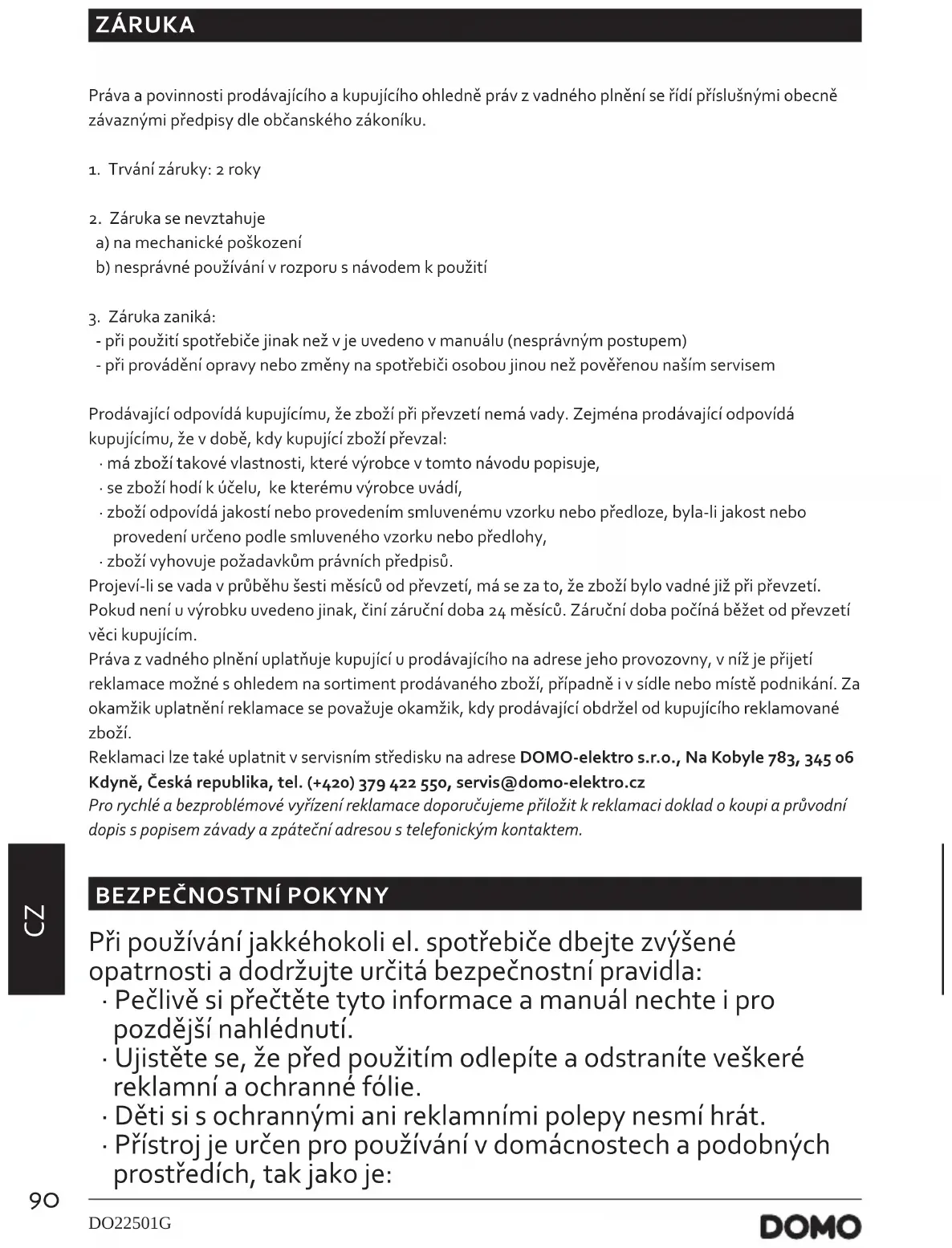 - zboží vyhovuje požadavkům právních předpisů. Projeví-li se vada v průběhu šesti měsíců od převzetí, má se za to, že zboží bylo vadné již při převzetí. Pokud není u výrobku uvedeno jinak, činí záruční doba 24 měsíců. Záruční doba počíná běžet od převzetí věci kupujícím. Práva z vadného plnění uplatňuje kupující u prodávajícího na adrese jeho provozovny, v níž je přijetí reklamace možné s ohledem na sortiment prodávaného zboží, případně i v sídle nebo místě podnikání. Za okamžik uplatnění reklamace se považuje okamžik, kdy prodávající obdržel od kupujícího reklamované zboží. Reklamaci lze také uplatnit v servisním středisku na adrese DOMO-elektro s.r.o., Na Kobyle 783, 345 06 Kdyně, Česká republika, tel. (+420) 379 422 550, servis@domo-elektro.cz Pro rychlé a bezproblémové vyřízení reklamace doporučujeme přiložit k reklamaci doklad o koupi a průvodní dopis s popisem závady a zpáteční adresou s telefonickým kontaktem.