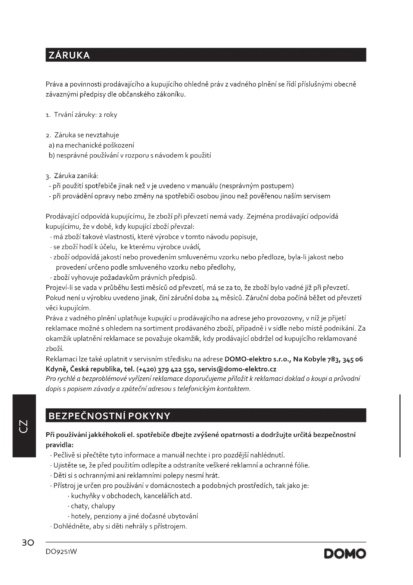 - zboží vyhovuje požadavkům právních předpisů. Projeví-li se vada v průběhu šesti měsíců od převzetí, má se za to, že zboží bylo vadné již při převzetí. Pokud není u výrobku uvedeno jinak, činí záruční doba 24 měsíců. Záruční doba počíná běžet od převzetí věci kupujícím. Práva z vadného plnění uplatňuje kupující u prodávajícího na adrese jeho provozovny, v níž je přijetí reklamace možné s ohledem na sortiment prodávaného zboží, případně i v sídle nebo místě podnikání. Za okamžik uplatnění reklamace se považuje okamžik, kdy prodávající obdržel od kupujícího reklamované zboží. Reklamaci lze také uplatnit v servisním středisku na adrese DOMO-elektro s.r.o., Na Kobyle 783, 345 06 Kdyně, Česká republika, tel. (+420) 379 422 550, servis@domo-elektro.cz Pro rychlé a bezproblémové vyřízení reklamace doporučujeme přiložit k reklamaci doklad o koupi a průvodní dopis s popisem závady a zpáteční adresou s telefonickým kontaktem.