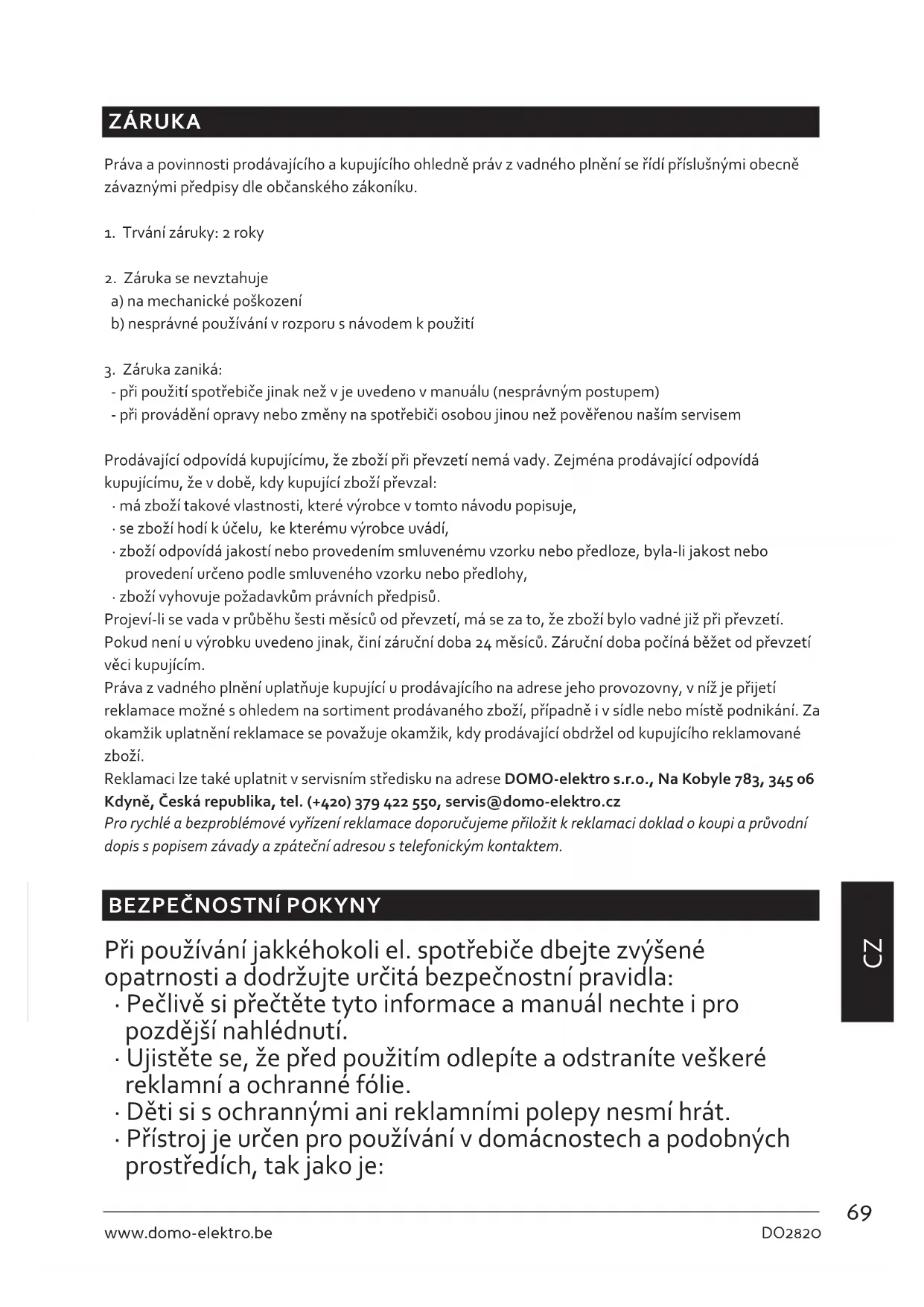 - zboží vyhovuje požadavkům právních předpisů. Projeví-li se vada v průběhu šesti měsíců od převzetí, má se za to, že zboží bylo vadné již při převzetí. Pokud není u výrobku uvedeno jinak, činí záruční doba 24 měsíců. Záruční doba počíná běžet od převzetí věci kupujícím. Práva z vadného plnění uplatňuje kupující u prodávajícího na adrese jeho provozovny, v níž je přijetí reklamace možné s ohledem na sortiment prodávaného zboží, případně i v sídle nebo místě podnikání. Za okamžik uplatnění reklamace se považuje okamžik, kdy prodávající obdržel od kupujícího reklamované zboží. Reklamaci lze také uplatnit v servisním středisku na adrese DOMO-elektro s.r.o., Na Kobyle 783, 345 06 Kdyně, Česká republika, tel. (+420) 379 422 550, servis@domo-elektro.cz Pro rychlé a bezproblémové vyřízení reklamace doporučujeme přiložit k reklamaci doklad o koupi a průvodní dopis s popisem závady a zpáteční adresou s telefonickým kontaktem.