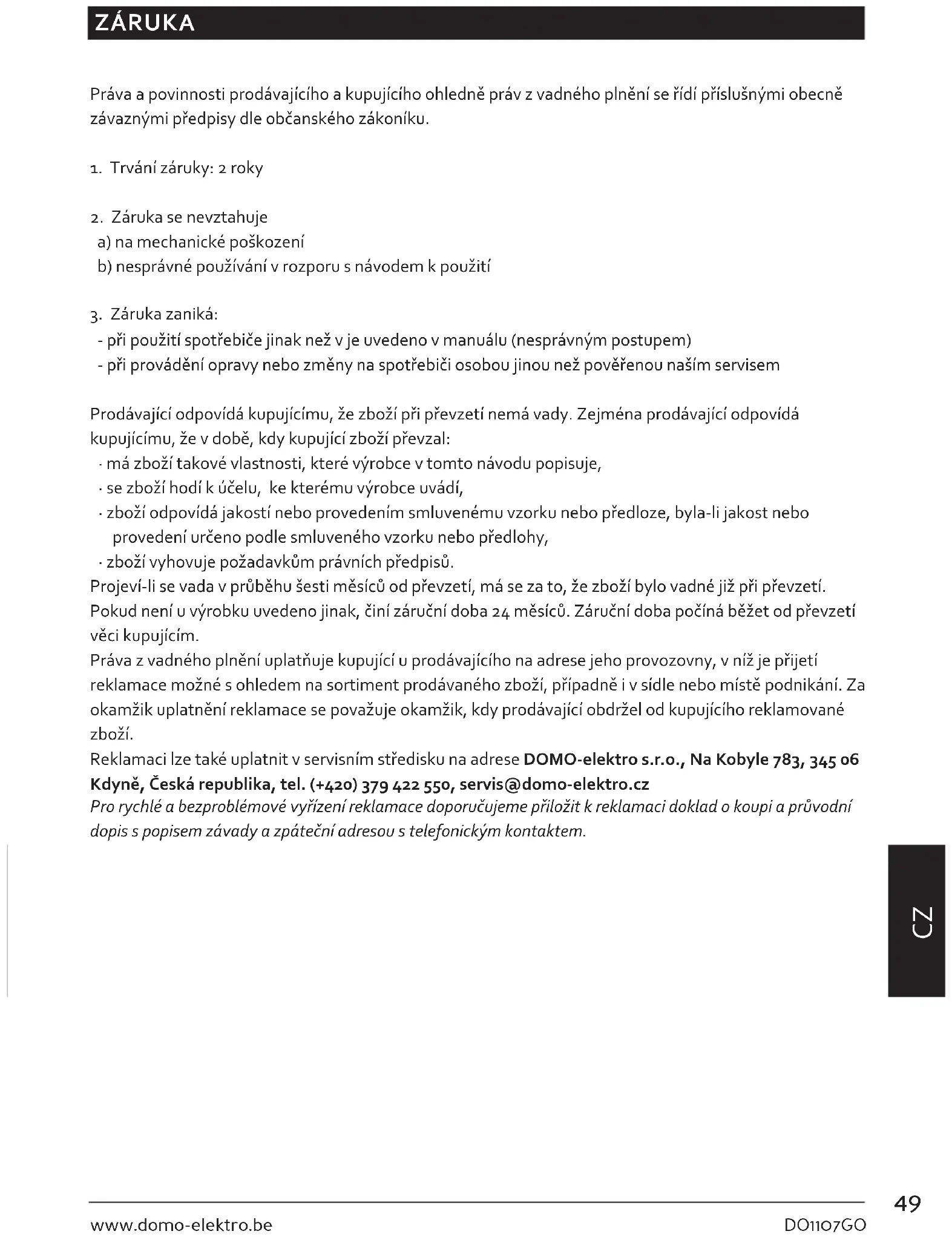 - zboží vyhovuje požadavkům právních předpisů. Projeví-li se vada v průběhu šesti měsíců od převzetí, má se za to, že zboží bylo vadné již při převzetí. Pokud není u výrobku uvedeno jinak, činí záruční doba 24 měsíců. Záruční doba počíná běžet od převzetí věci kupujícím. Práva z vadného plnění uplatňuje kupující u prodávajícího na adrese jeho provozovny, v níž je přijetí reklamace možné s ohledem na sortiment prodávaného zboží, případně i v sídle nebo místě podnikání. Za okamžik uplatnění reklamace se považuje okamžik, kdy prodávající obdržel od kupujícího reklamované zboží. Reklamaci lze také uplatnit v servisním středisku na adrese DOMO-elektro s.r.o., Na Kobyle 783, 345 06 Kdyně, Česká republika, tel. (+420) 379 422 550, servis@domo-elektro.cz Pro rychlé a bezproblémové vyřízení reklamace doporučujeme přiložit k reklamaci doklad o koupi a průvodní dopis s popisem závady a zpáteční adresou s telefonickým kontaktem.50 DO1107GO