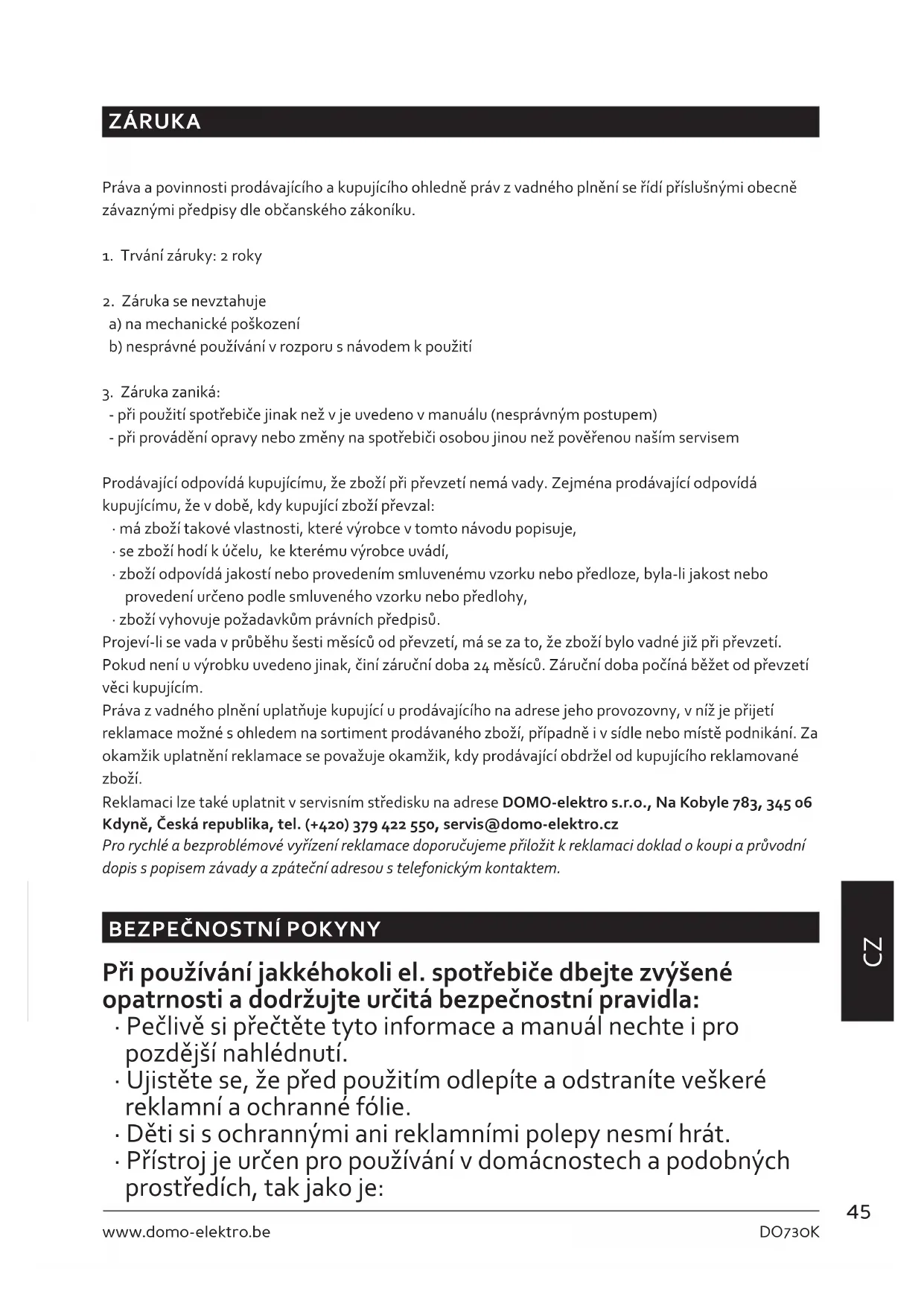 - zboží vyhovuje požadavkům právních předpisů. Projeví-li se vada v průběhu šesti měsíců od převzetí, má se za to, že zboží bylo vadné již při převzetí. Pokud není u výrobku uvedeno jinak, činí záruční doba 24 měsíců. Záruční doba počíná běžet od převzetí věci kupujícím. Práva z vadného plnění uplatňuje kupující u prodávajícího na adrese jeho provozovny, v níž je přijetí reklamace možné s ohledem na sortiment prodávaného zboží, případně i v sídle nebo místě podnikání. Za okamžik uplatnění reklamace se považuje okamžik, kdy prodávající obdržel od kupujícího reklamované zboží. Reklamaci lze také uplatnit v servisním středisku na adrese DOMO-elektro s.r.o., Na Kobyle 783, 345 06 Kdyně, Česká republika, tel. (+420) 379 422 550, servis@domo-elektro.cz Pro rychlé a bezproblémové vyřízení reklamace doporučujeme přiložit k reklamaci doklad o koupi a průvodní dopis s popisem závady a zpáteční adresou s telefonickým kontaktem.