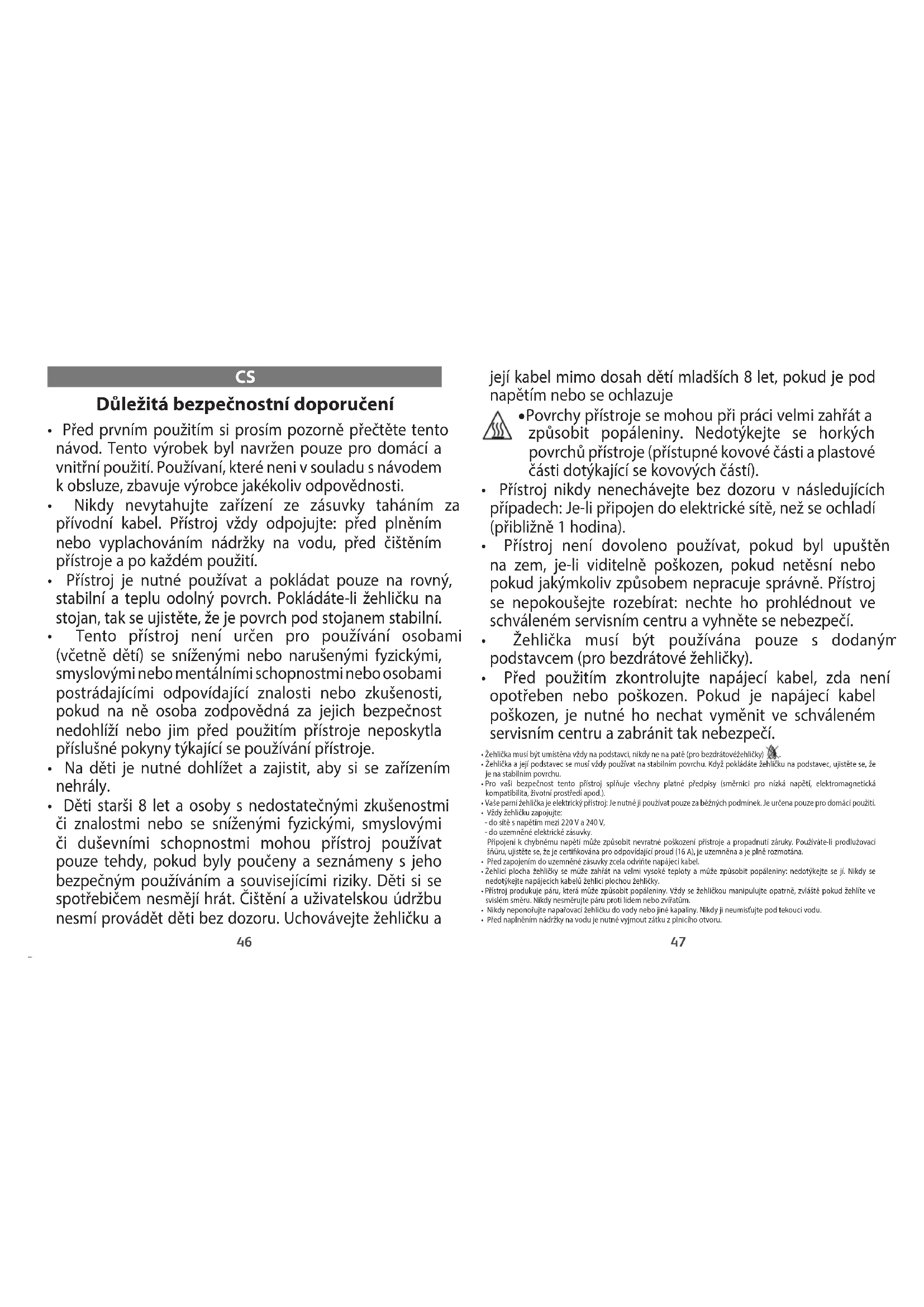 - Děti starši 8 let a osoby s nedostatečnými zkušenostmi či znalostmi nebo se sníženými fyzickými, smyslovými či duševními schopnostmi mohou přístroj používat pouze tehdy, pokud byly poučeny a seznámeny s jeho bezpečným používáním a souvisejícími riziky. Děti si se spotřebičem nesmějí hrát. Čištění a uživatelskou údržbu nesmí provádět děti bez dozoru. Uchovávejte žehličku a