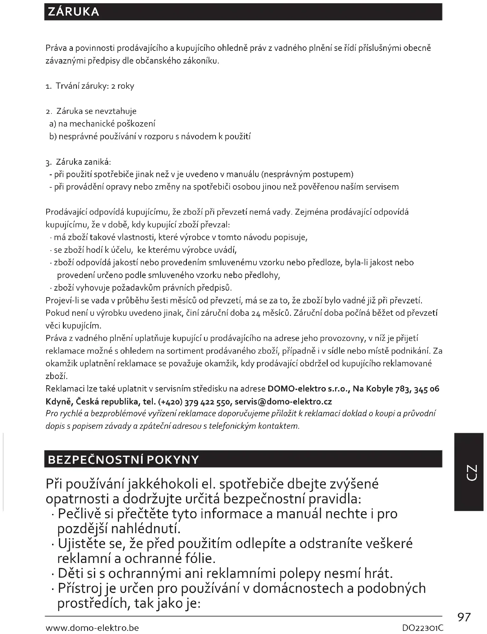 - zboží vyhovuje požadavkům právních předpisů. Projeví-li se vada v průběhu šesti měsíců od převzetí, má se za to, že zboží bylo vadné již při převzetí. Pokud není u výrobku uvedeno jinak, činí záruční doba 24 měsíců. Záruční doba počíná běžet od převzetí věci kupujícím. Práva z vadného plnění uplatňuje kupující u prodávajícího na adrese jeho provozovny, v níž je přijetí reklamace možné s ohledem na sortiment prodávaného zboží, případně i v sídle nebo místě podnikání. Za okamžik uplatnění reklamace se považuje okamžik, kdy prodávající obdržel od kupujícího reklamované zboží. Reklamaci lze také uplatnit v servisním středisku na adrese DOMO-elektro s.r.o., Na Kobyle 783, 345 06 Kdyně, Česká republika, tel. (+420) 379 422 550, servis@domo-elektro.cz Pro rychlé a bezproblémové vyřízení reklamace doporučujeme přiložit k reklamaci doklad o koupi a průvodní dopis s popisem závady a zpáteční adresou s telefonickým kontaktem.