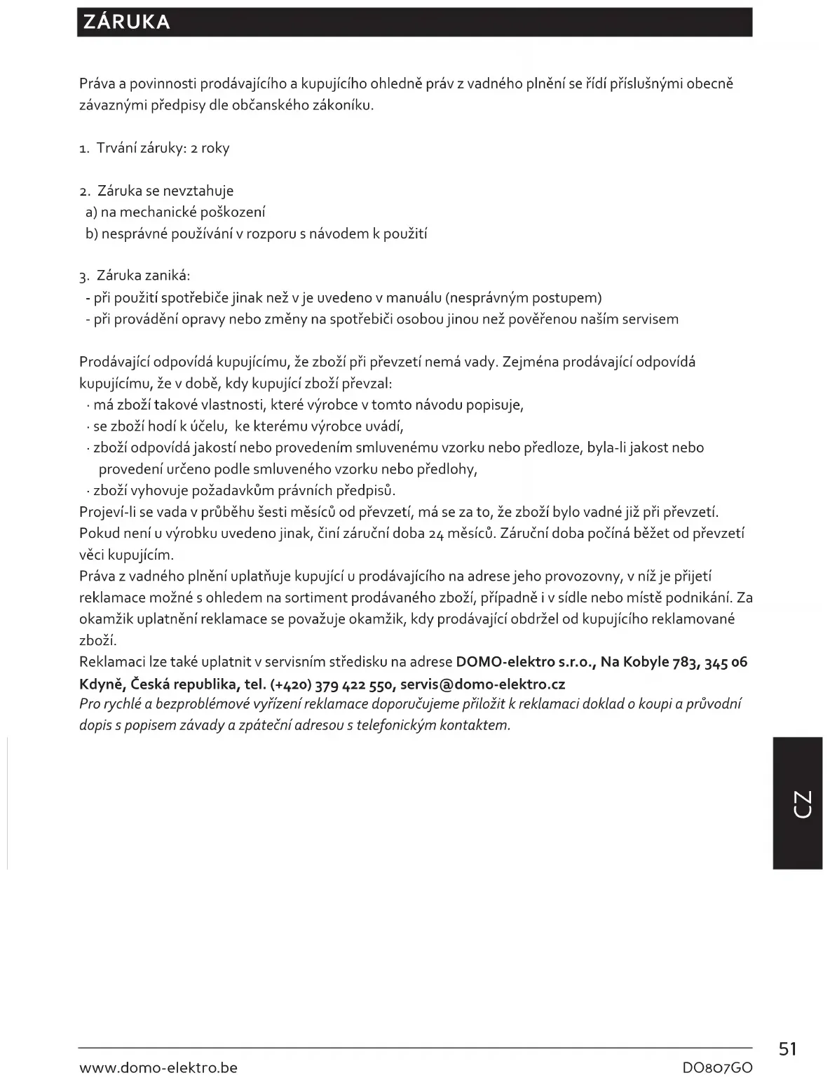 - zboží vyhovuje požadavkům právních předpisů. Projeví-li se vada v průběhu šesti měsíců od převzetí, má se za to, že zboží bylo vadné již při převzetí. Pokud není u výrobku uvedeno jinak, činí záruční doba 24 měsíců. Záruční doba počíná běžet od převzetí věci kupujícím. Práva z vadného plnění uplatňuje kupující u prodávajícího na adrese jeho provozovny, v níž je přijetí reklamace možné s ohledem na sortiment prodávaného zboží, případně i v sídle nebo místě podnikání. Za okamžik uplatnění reklamace se považuje okamžik, kdy prodávající obdržel od kupujícího reklamované zboží. Reklamaci lze také uplatnit v servisním středisku na adrese DOMO-elektro s.r.o., Na Kobyle 783, 345 06 Kdyně, Česká republika, tel. (+420) 379 422 550, servis@domo-elektro.cz Pro rychlé a bezproblémové vyřízení reklamace doporučujeme přiložit k reklamaci doklad o koupi a průvodní dopis s popisem závady a zpáteční adresou s telefonickým kontaktem.52 DO807GO