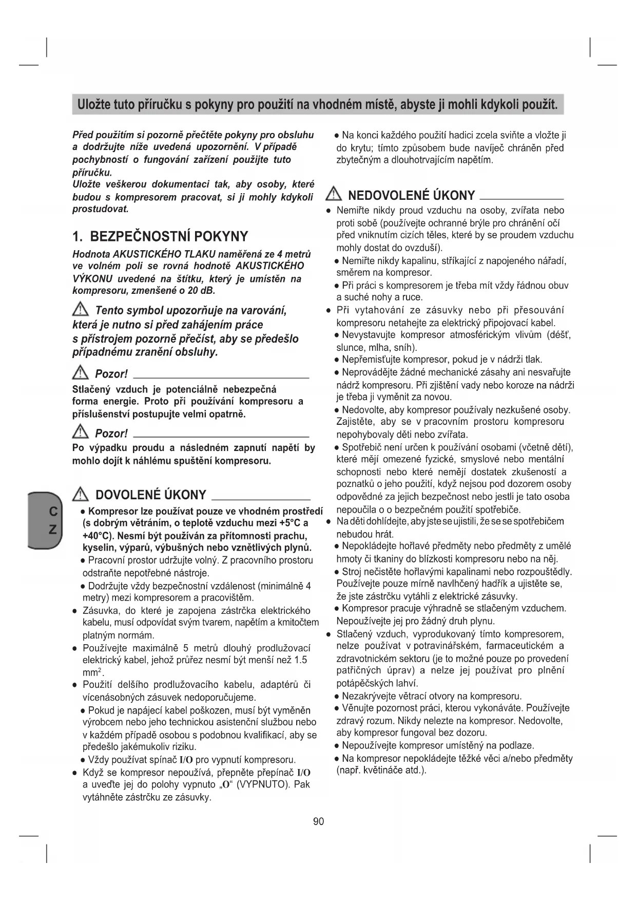 Hodnota AKUSTICKÉHO TLAKU naměřená ze 4 metrů ve volném poli se rovná hodnotě AKUSTICKÉHO VÝKONU uvedené na štítku, který je umístěn na kompresoru, zmenšené o 20 dB. Tento symbol upozorňuje na varování, která je nutno si před zahájením práce s přístrojem pozorně přečíst, aby se předešlo případnému zranění obsluhy. Pozor! Stlačený vzduch je potenciálně nebezpečná forma energie. Proto při používání kompresoru a příslušenství postupujte velmi opatrně. Pozor! Po výpadku proudu a následném zapnutí napětí by mohlo dojít k náhlému spuštění kompresoru. DOVOLENÉ ÚKONY ● Kompresor lze používat pouze ve vhodném prostředí (s dobrým větráním, o teplotě vzduchu mezi +5°C a +40°C). Nesmí být používán za přítomnosti prachu, kyselin, výparů, výbušných nebo vznětlivých plynů. ● Pracovní prostor udržujte volný. Z pracovního prostoru odstraňte nepotřebné nástroje. ● Dodržujte vždy bezpečnostní vzdálenost (minimálně 4 metry) mezi kompresorem a pracovištěm. ● Zásuvka, do které je zapojena zástrčka elektrického kabelu, musí odpovídat svým tvarem, napětím a kmitočtem platným normám. ● Používejte maximálně 5 metrů dlouhý prodlužovací elektrický kabel, jehož průřez nesmí být menší než 1.5