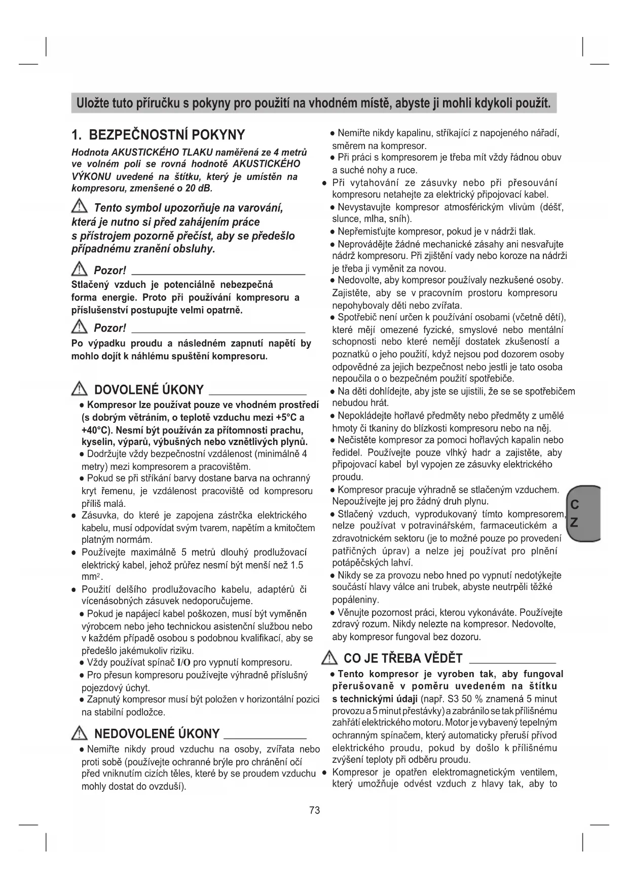 Hodnota AKUSTICKÉHO TLAKU naměřená ze 4 metrů ve volném poli se rovná hodnotě AKUSTICKÉHO VÝKONU uvedené na štítku, který je umístěn na kompresoru, zmenšené o 20 dB. Tento symbol upozorňuje na varování, která je nutno si před zahájením práce s přístrojem pozorně přečíst, aby se předešlo případnému zranění obsluhy. Pozor! Stlačený vzduch je potenciálně nebezpečná forma energie. Proto při používání kompresoru a příslušenství postupujte velmi opatrně. Pozor! Po výpadku proudu a následném zapnutí napětí by mohlo dojít k náhlému spuštění kompresoru. DOVOLENÉ ÚKONY ● Kompresor lze používat pouze ve vhodném prostředí (s dobrým větráním, o teplotě vzduchu mezi +5°C a +40°C). Nesmí být používán za přítomnosti prachu, kyselin, výparů, výbušných nebo vznětlivých plynů. ● Dodržujte vždy bezpečnostní vzdálenost (minimálně 4 metry) mezi kompresorem a pracovištěm. ● Pokud se při stříkání barvy dostane barva na ochranný kryt řemenu, je vzdálenost pracoviště od kompresoru příliš malá. ● Zásuvka, do které je zapojena zástrčka elektrického kabelu, musí odpovídat svým tvarem, napětím a kmitočtem platným normám. ● Používejte maximálně 5 metrů dlouhý prodlužovací elektrický kabel, jehož průřez nesmí být menší než 1.5