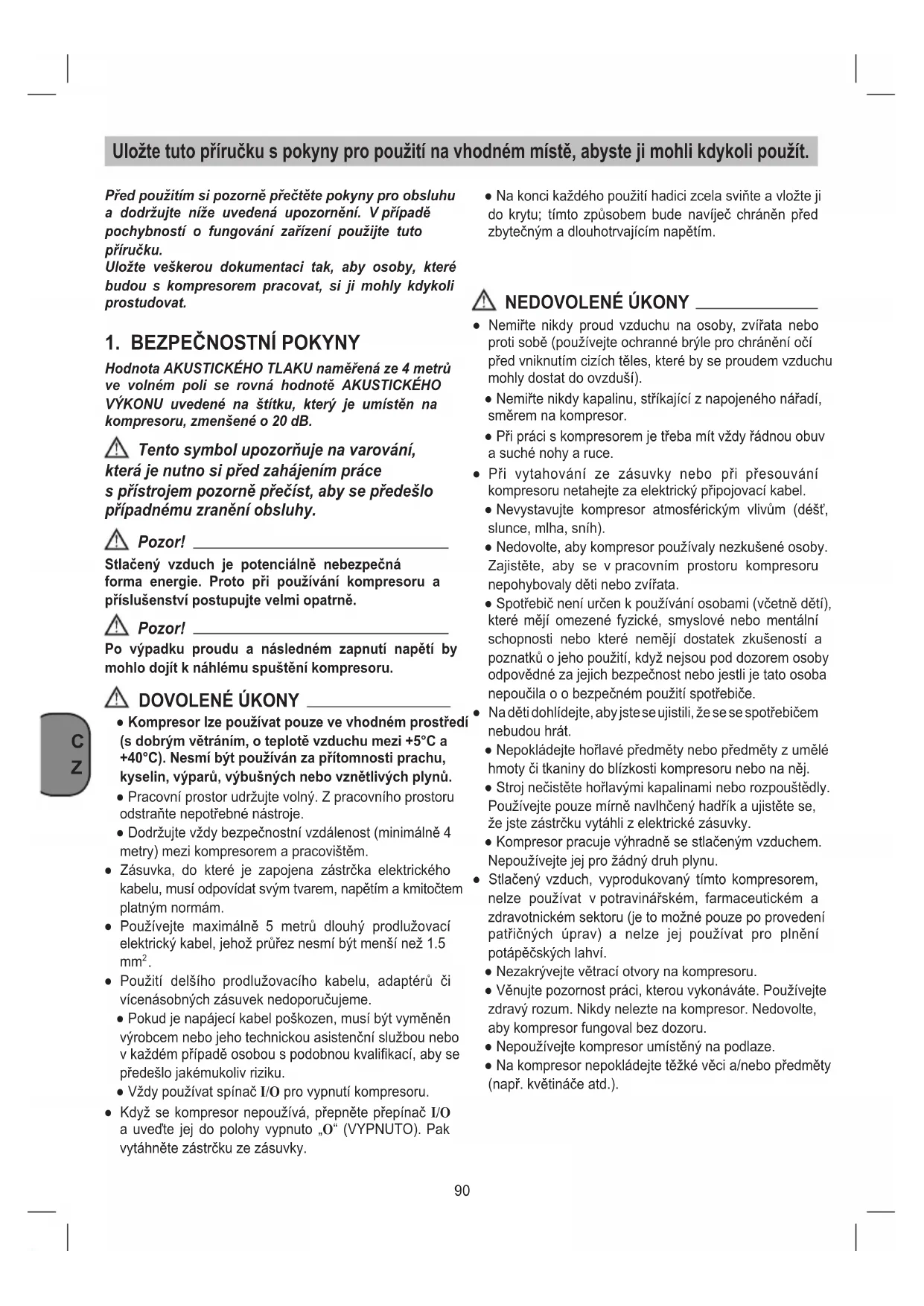 Hodnota AKUSTICKÉHO TLAKU naměřená ze 4 metrů ve volném poli se rovná hodnotě AKUSTICKÉHO VÝKONU uvedené na štítku, který je umístěn na kompresoru, zmenšené o 20 dB. Tento symbol upozorňuje na varování, která je nutno si před zahájením práce s přístrojem pozorně přečíst, aby se předešlo případnému zranění obsluhy. Pozor! Stlačený vzduch je potenciálně nebezpečná forma energie. Proto při používání kompresoru a příslušenství postupujte velmi opatrně. Pozor! Po výpadku proudu a následném zapnutí napětí by mohlo dojít k náhlému spuštění kompresoru. DOVOLENÉ ÚKONY ● Kompresor lze používat pouze ve vhodném prostředí (s dobrým větráním, o teplotě vzduchu mezi +5°C a +40°C). Nesmí být používán za přítomnosti prachu, kyselin, výparů, výbušných nebo vznětlivých plynů. ● Pracovní prostor udržujte volný. Z pracovního prostoru odstraňte nepotřebné nástroje. ● Dodržujte vždy bezpečnostní vzdálenost (minimálně 4 metry) mezi kompresorem a pracovištěm. ● Zásuvka, do které je zapojena zástrčka elektrického kabelu, musí odpovídat svým tvarem, napětím a kmitočtem platným normám. ● Používejte maximálně 5 metrů dlouhý prodlužovací elektrický kabel, jehož průřez nesmí být menší než 1.5