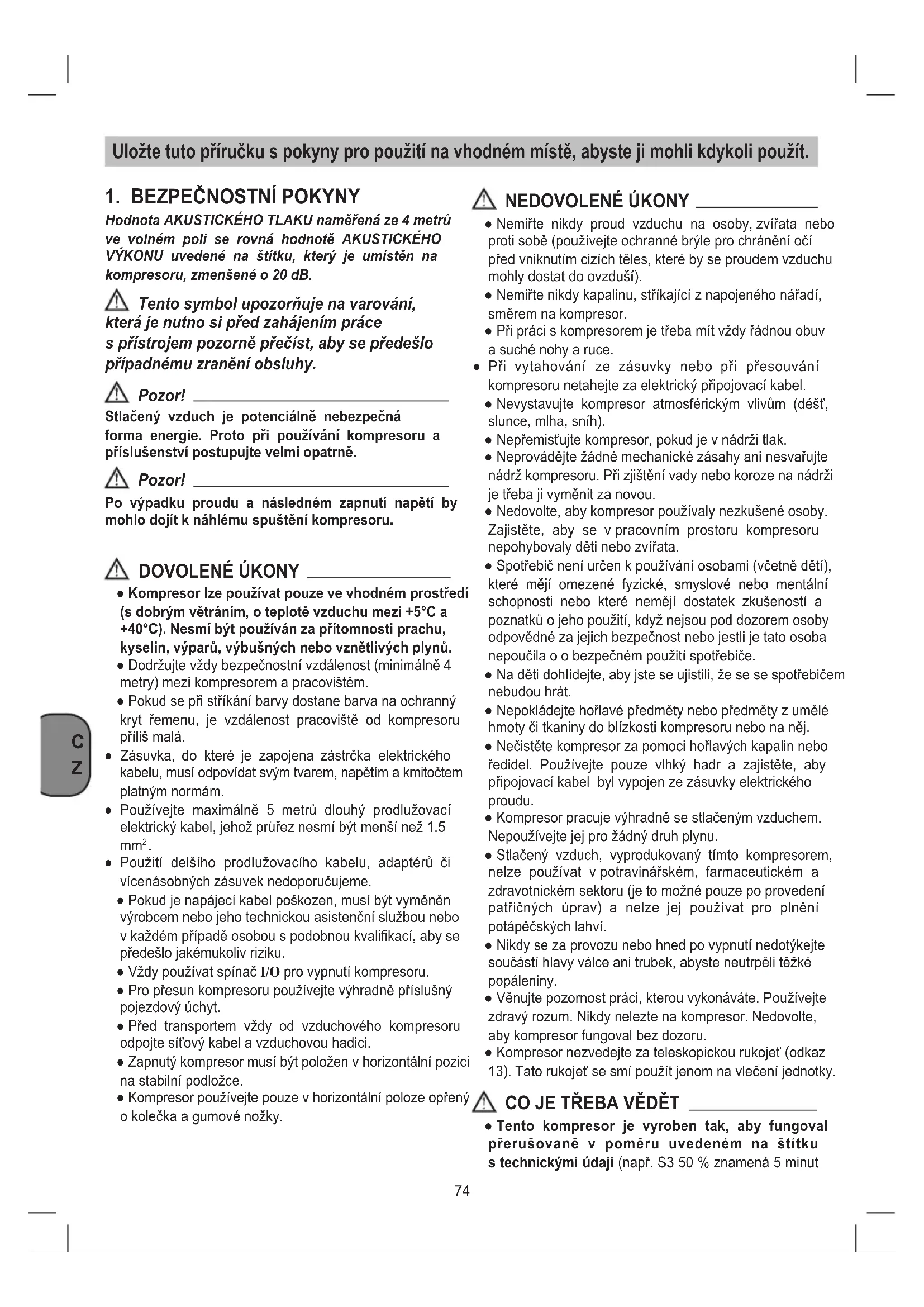 Hodnota AKUSTICKÉHO TLAKU naměřená ze 4 metrů ve volném poli se rovná hodnotě AKUSTICKÉHO VÝKONU uvedené na štítku, který je umístěn na kompresoru, zmenšené o 20 dB. Tento symbol upozorňuje na varování, která je nutno si před zahájením práce s přístrojem pozorně přečíst, aby se předešlo případnému zranění obsluhy. Pozor! Stlačený vzduch je potenciálně nebezpečná forma energie. Proto při používání kompresoru a příslušenství postupujte velmi opatrně. Pozor! Po výpadku proudu a následném zapnutí napětí by mohlo dojít k náhlému spuštění kompresoru. DOVOLENÉ ÚKONY ● Kompresor lze používat pouze ve vhodném prostředí (s dobrým větráním, o teplotě vzduchu mezi +5°C a +40°C). Nesmí být používán za přítomnosti prachu, kyselin, výparů, výbušných nebo vznětlivých plynů. ● Dodržujte vždy bezpečnostní vzdálenost (minimálně 4 metry) mezi kompresorem a pracovištěm. ● Pokud se při stříkání barvy dostane barva na ochranný kryt řemenu, je vzdálenost pracoviště od kompresoru příliš malá. ● Zásuvka, do které je zapojena zástrčka elektrického kabelu, musí odpovídat svým tvarem, napětím a kmitočtem platným normám. ● Používejte maximálně 5 metrů dlouhý prodlužovací elektrický kabel, jehož průřez nesmí být menší než 1.5