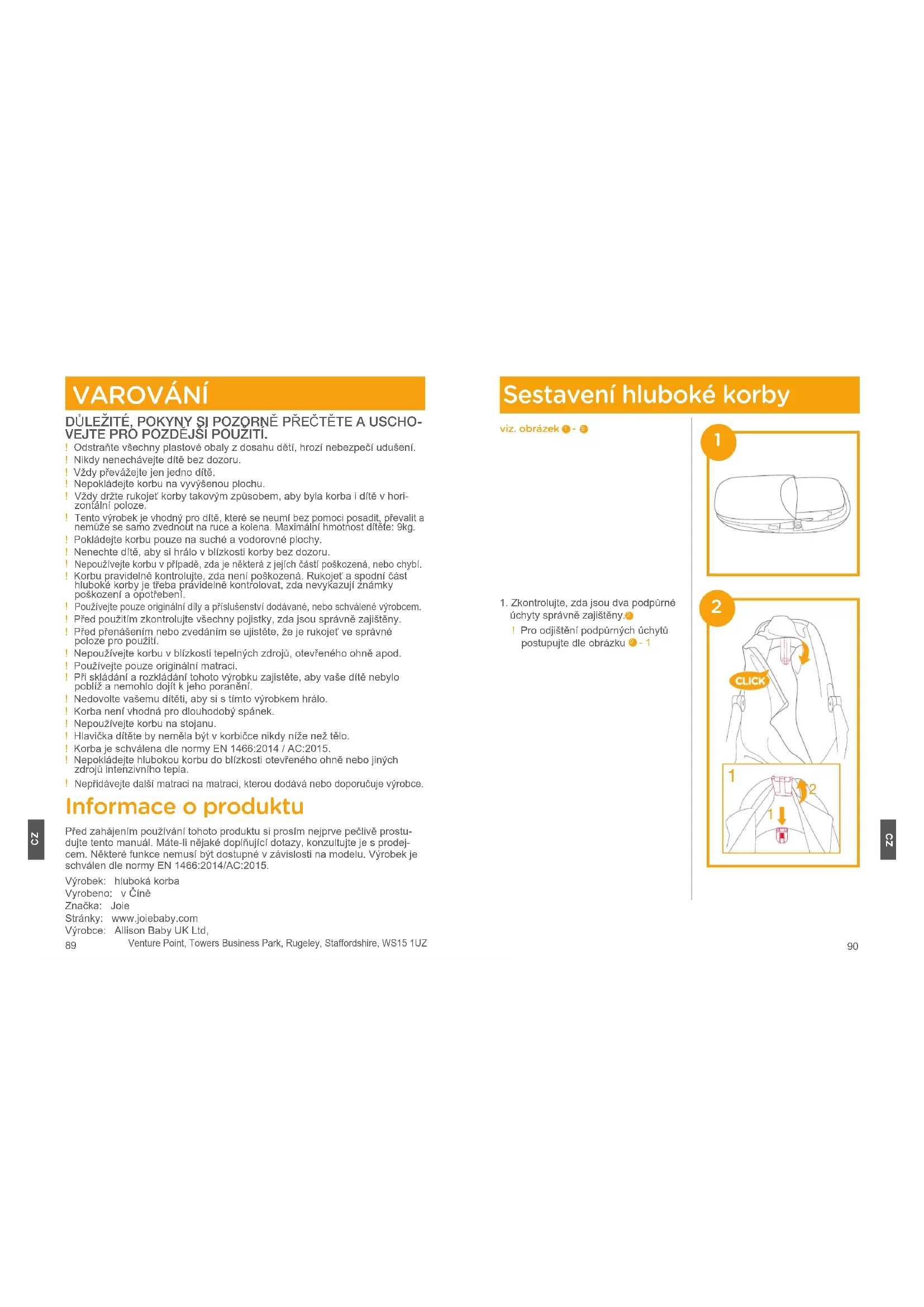 VAROVÁNÍ DŮLEŽITÉ, POKYNY SI POZORNĚ PŘEČTĚTE A USCHO- VEJTE PRO POZDĚJŠÍ POUŽITÍ.! Odstraňte všechny plastové obaly z dosahu dětí, hrozí nebezpečí udušení.! Nikdy nenechávejte dítě bez dozoru.! Vždy převážejte jen jedno dítě.! Nepokládejte korbu na vyvýšenou plochu. ! Vždy držte rukojeť korby takovým způsobem, aby byla korba i dítě v hori- zontální poloze.! Tento výrobek je vhodný pro dítě, které se neumí bez pomoci posadit, převalit a nemůže se samo zvednout na ruce a kolena. Maximální hmotnost dítěte: 9kg.! Pokládejte korbu pouze na suché a vodorovné plochy.! Nenechte dítě, aby si hrálo v blízkosti korby bez dozoru.! Nepoužívejte korbu v případě, zda je některá z jejích částí poškozená, nebo chybí.! Korbu pravidelně kontrolujte, zda není poškozená. Rukojeť a spodní část hluboké korby je třeba pravidelně kontrolovat, zda nevykazují známky poškození a opotřebení.! Používejte pouze originální díly a příslušenství dodávané, nebo schválené výrobcem.! Před použitím zkontrolujte všechny pojistky, zda jsou správně zajištěny.! Před přenášením nebo zvedáním se ujistěte, že je rukojeť ve správné poloze pro použití.! Nepoužívejte korbu v blízkosti tepelných zdrojů, otevřeného ohně apod.! Používejte pouze originální matraci.! Při skládání a rozkládání tohoto výrobku zajistěte, aby vaše dítě nebylo poblíž a nemohlo dojít k jeho poranění.! Nedovolte vašemu dítěti, aby si s tímto výrobkem hrálo.! Korba není vhodná pro dlouhodobý spánek.! Nepoužívejte korbu na stojanu.! Hlavička dítěte by neměla být v korbičce nikdy níže než tělo.! Korba je schválena dle normy EN 1466:2014 / AC:2015.! Nepokládejte hlubokou korbu do blízkosti otevřeného ohně nebo jiných zdrojů intenzivního tepla.! Nepřidávejte další matraci na matraci, kterou dodává nebo doporučuje výrobce. Informace o produktu Před zahájením používání tohoto produktu si prosím nejprve pečlivě prostu- dujte tento manuál. Máte-li nějaké doplňující dotazy, konzultujte je s prodej-cem. Některé funkce nemusí být dostupné v závislosti na modelu. Výrobek je schválen dle normy EN 1466:2014/AC:2015.Výrobek: hluboká korbaVyrobeno: v ČíněZnačka: JoieStránky: www.joiebaby.comVýrobce: Allison Baby UK Ltd, Venture Point, Towers Business Park, Rugeley, Staffordshire, WS15 1UZ Sestavení hluboké korby viz. obrázek