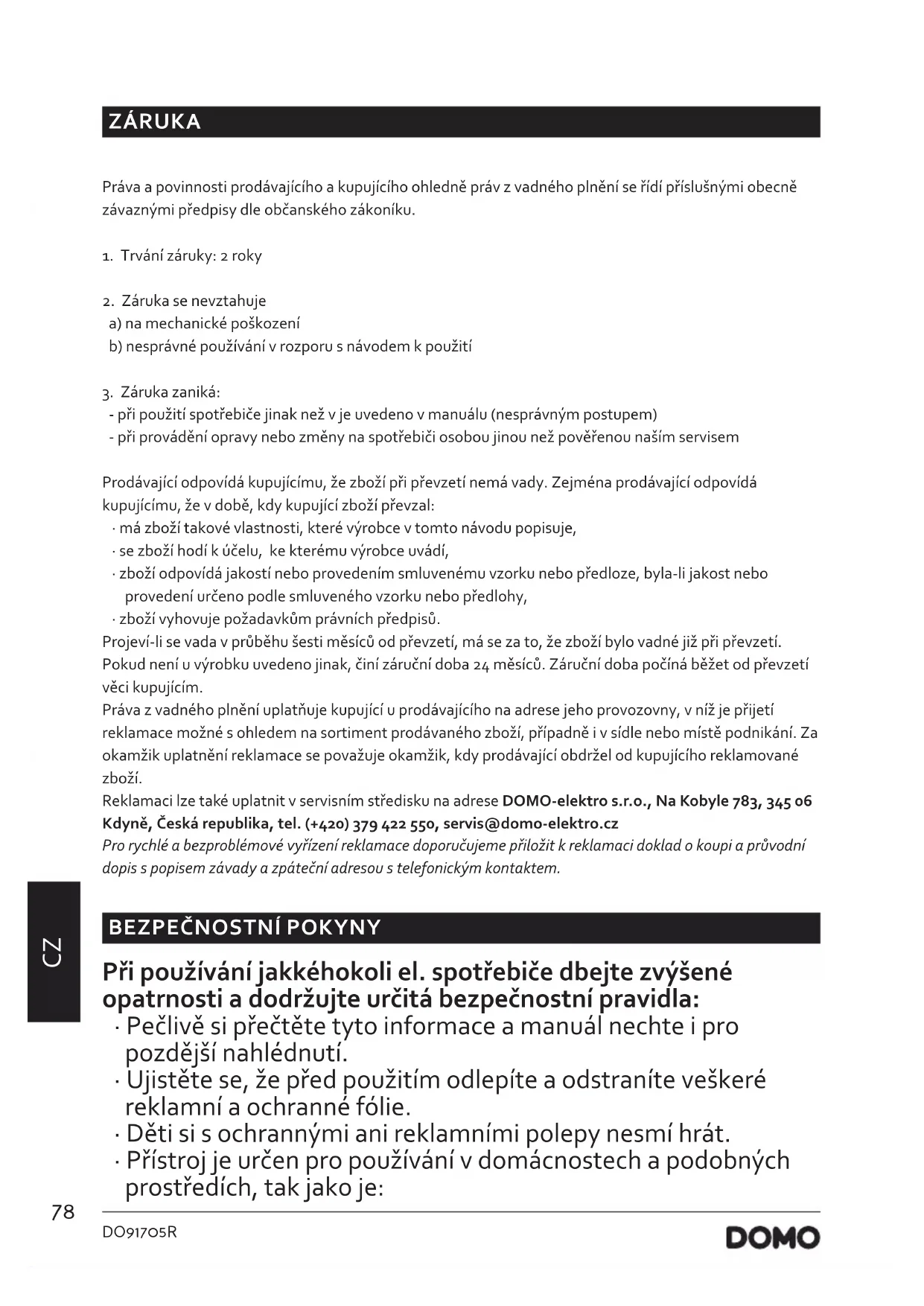 - zboží vyhovuje požadavkům právních předpisů. Projeví-li se vada v průběhu šesti měsíců od převzetí, má se za to, že zboží bylo vadné již při převzetí. Pokud není u výrobku uvedeno jinak, činí záruční doba 24 měsíců. Záruční doba počíná běžet od převzetí věci kupujícím. Práva z vadného plnění uplatňuje kupující u prodávajícího na adrese jeho provozovny, v níž je přijetí reklamace možné s ohledem na sortiment prodávaného zboží, případně i v sídle nebo místě podnikání. Za okamžik uplatnění reklamace se považuje okamžik, kdy prodávající obdržel od kupujícího reklamované zboží. Reklamaci lze také uplatnit v servisním středisku na adrese DOMO-elektro s.r.o., Na Kobyle 783, 345 06 Kdyně, Česká republika, tel. (+420) 379 422 550, servis@domo-elektro.cz Pro rychlé a bezproblémové vyřízení reklamace doporučujeme přiložit k reklamaci doklad o koupi a průvodní dopis s popisem závady a zpáteční adresou s telefonickým kontaktem.