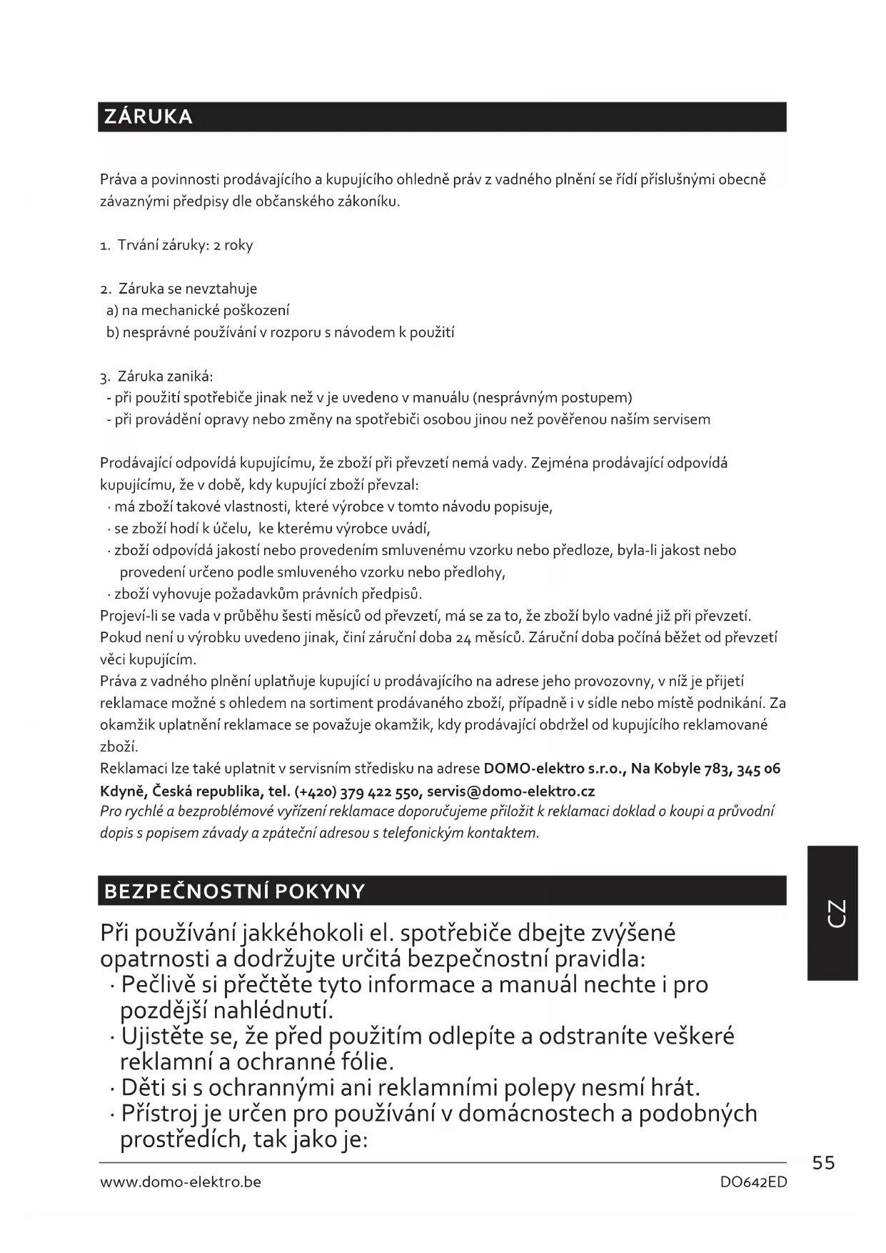 - zboží vyhovuje požadavkům právních předpisů. Projeví-li se vada v průběhu šesti měsíců od převzetí, má se za to, že zboží bylo vadné již při převzetí. Pokud není u výrobku uvedeno jinak, činí záruční doba 24 měsíců. Záruční doba počíná běžet od převzetí věci kupujícím. Práva z vadného plnění uplatňuje kupující u prodávajícího na adrese jeho provozovny, v níž je přijetí reklamace možné s ohledem na sortiment prodávaného zboží, případně i v sídle nebo místě podnikání. Za okamžik uplatnění reklamace se považuje okamžik, kdy prodávající obdržel od kupujícího reklamované zboží. Reklamaci lze také uplatnit v servisním středisku na adrese DOMO-elektro s.r.o., Na Kobyle 783, 345 06 Kdyně, Česká republika, tel. (+420) 379 422 550, servis@domo-elektro.cz Pro rychlé a bezproblémové vyřízení reklamace doporučujeme přiložit k reklamaci doklad o koupi a průvodní dopis s popisem závady a zpáteční adresou s telefonickým kontaktem.