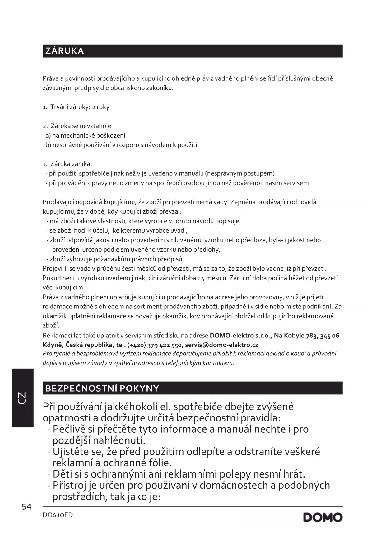 - zboží vyhovuje požadavkům právních předpisů. Projeví-li se vada v průběhu šesti měsíců od převzetí, má se za to, že zboží bylo vadné již při převzetí. Pokud není u výrobku uvedeno jinak, činí záruční doba 24 měsíců. Záruční doba počíná běžet od převzetí věci kupujícím. Práva z vadného plnění uplatňuje kupující u prodávajícího na adrese jeho provozovny, v níž je přijetí reklamace možné s ohledem na sortiment prodávaného zboží, případně i v sídle nebo místě podnikání. Za okamžik uplatnění reklamace se považuje okamžik, kdy prodávající obdržel od kupujícího reklamované zboží. Reklamaci lze také uplatnit v servisním středisku na adrese DOMO-elektro s.r.o., Na Kobyle 783, 345 06 Kdyně, Česká republika, tel. (+420) 379 422 550, servis@domo-elektro.cz Pro rychlé a bezproblémové vyřízení reklamace doporučujeme přiložit k reklamaci doklad o koupi a průvodní dopis s popisem závady a zpáteční adresou s telefonickým kontaktem.