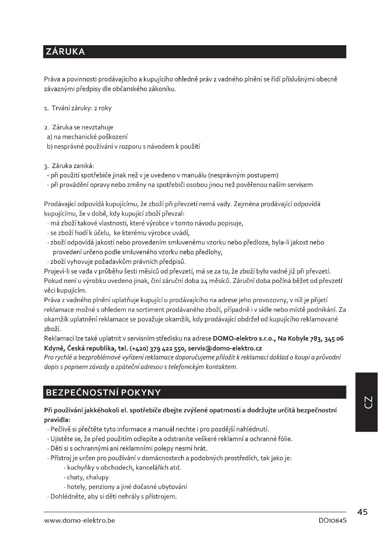 - zboží vyhovuje požadavkům právních předpisů. Projeví-li se vada v průběhu šesti měsíců od převzetí, má se za to, že zboží bylo vadné již při převzetí. Pokud není u výrobku uvedeno jinak, činí záruční doba 24 měsíců. Záruční doba počíná běžet od převzetí věci kupujícím. Práva z vadného plnění uplatňuje kupující u prodávajícího na adrese jeho provozovny, v níž je přijetí reklamace možné s ohledem na sortiment prodávaného zboží, případně i v sídle nebo místě podnikání. Za okamžik uplatnění reklamace se považuje okamžik, kdy prodávající obdržel od kupujícího reklamované zboží. Reklamaci lze také uplatnit v servisním středisku na adrese DOMO-elektro s.r.o., Na Kobyle 783, 345 06 Kdyně, Česká republika, tel. (+420) 379 422 550, servis@domo-elektro.cz Pro rychlé a bezproblémové vyřízení reklamace doporučujeme přiložit k reklamaci doklad o koupi a průvodní dopis s popisem závady a zpáteční adresou s telefonickým kontaktem.