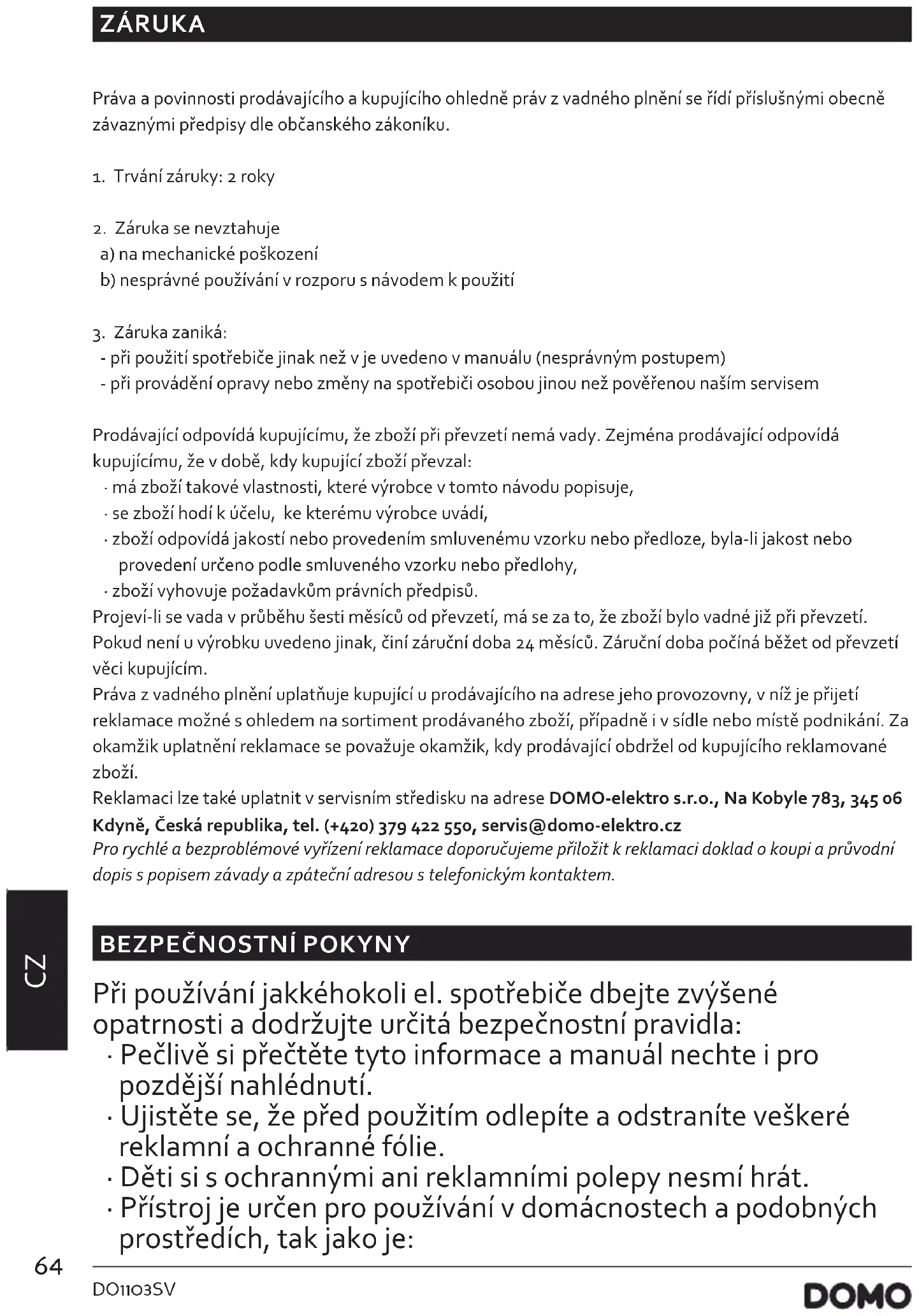 - zboží vyhovuje požadavkům právních předpisů. Projeví-li se vada v průběhu šesti měsíců od převzetí, má se za to, že zboží bylo vadné již při převzetí. Pokud není u výrobku uvedeno jinak, činí záruční doba 24 měsíců. Záruční doba počíná běžet od převzetí věci kupujícím. Práva z vadného plnění uplatňuje kupující u prodávajícího na adrese jeho provozovny, v níž je přijetí reklamace možné s ohledem na sortiment prodávaného zboží, případně i v sídle nebo místě podnikání. Za okamžik uplatnění reklamace se považuje okamžik, kdy prodávající obdržel od kupujícího reklamované zboží. Reklamaci lze také uplatnit v servisním středisku na adrese DOMO-elektro s.r.o., Na Kobyle 783, 345 06 Kdyně, Česká republika, tel. (+420) 379 422 550, servis@domo-elektro.cz Pro rychlé a bezproblémové vyřízení reklamace doporučujeme přiložit k reklamaci doklad o koupi a průvodní dopis s popisem závady a zpáteční adresou s telefonickým kontaktem.