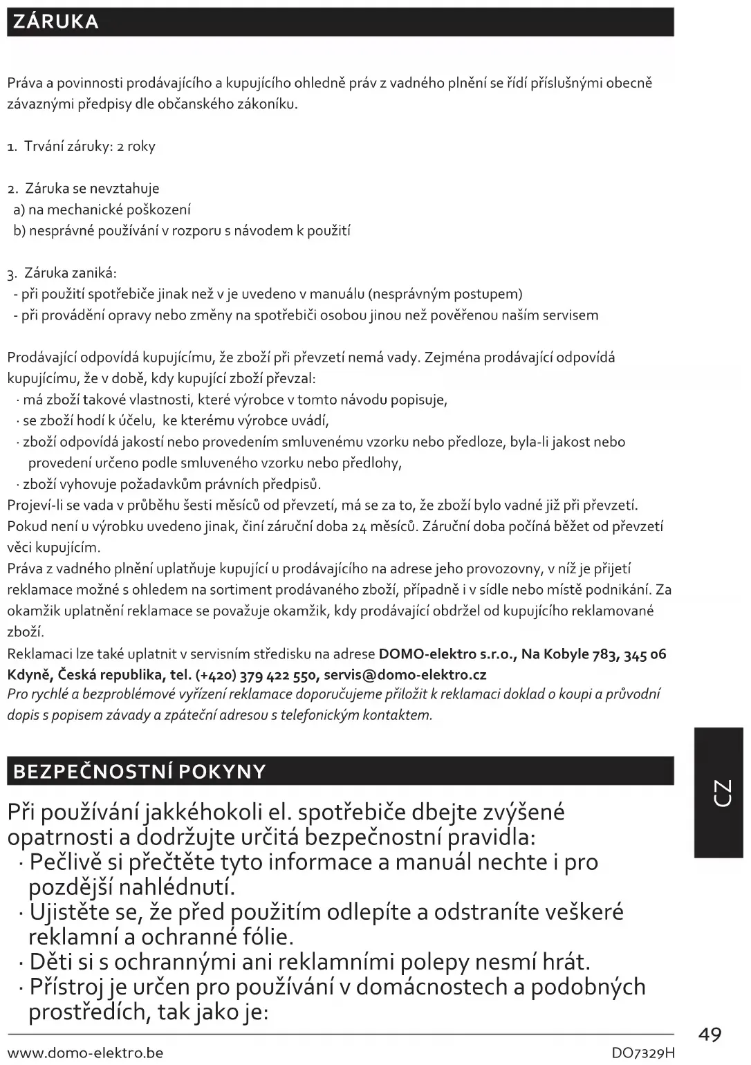 - zboží vyhovuje požadavkům právních předpisů. Projeví-li se vada v průběhu šesti měsíců od převzetí, má se za to, že zboží bylo vadné již při převzetí. Pokud není u výrobku uvedeno jinak, činí záruční doba 24 měsíců. Záruční doba počíná běžet od převzetí věci kupujícím. Práva z vadného plnění uplatňuje kupující u prodávajícího na adrese jeho provozovny, v níž je přijetí reklamace možné s ohledem na sortiment prodávaného zboží, případně i v sídle nebo místě podnikání. Za okamžik uplatnění reklamace se považuje okamžik, kdy prodávající obdržel od kupujícího reklamované zboží. Reklamaci lze také uplatnit v servisním středisku na adrese DOMO-elektro s.r.o., Na Kobyle 783, 345 06 Kdyně, Česká republika, tel. (+420) 379 422 550, servis@domo-elektro.cz Pro rychlé a bezproblémové vyřízení reklamace doporučujeme přiložit k reklamaci doklad o koupi a průvodní dopis s popisem závady a zpáteční adresou s telefonickým kontaktem.