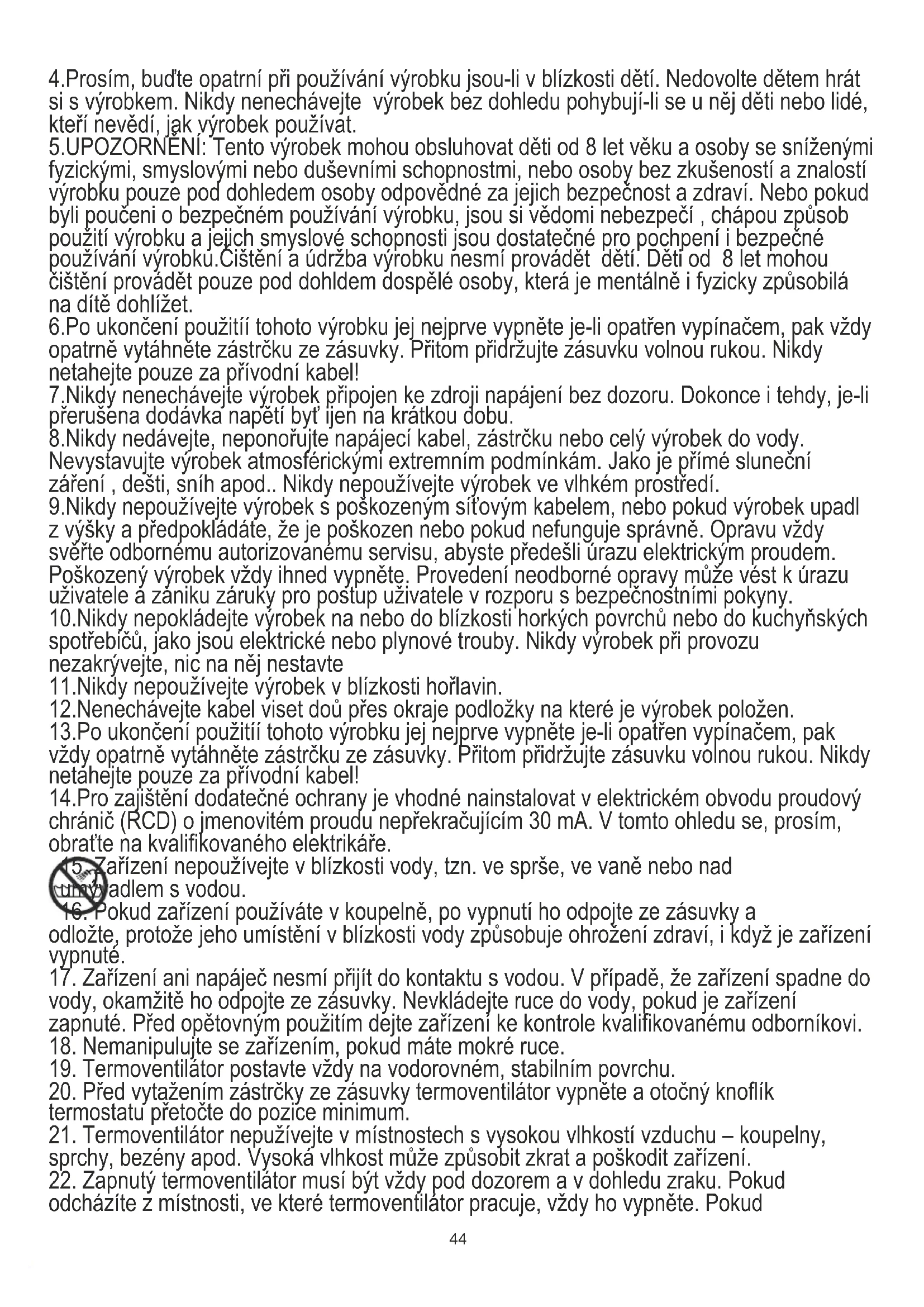 21. Termoventilátor nepužívejte v místnostech s vysokou vlhkostí vzduchu – koupelny,