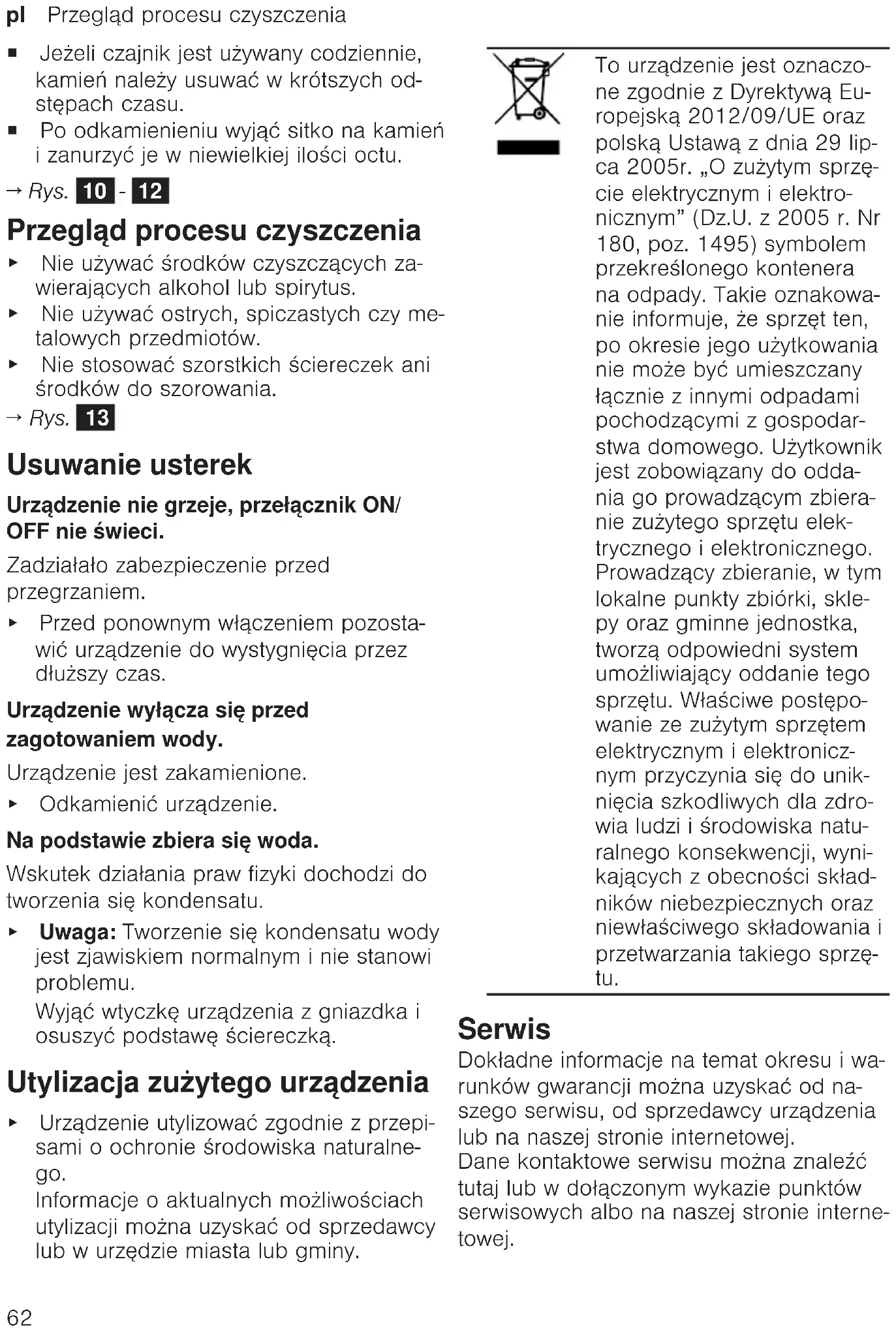 Odstranění poruch Spotřebič neohřívá a vypínač nesvítí. Je aktivní ochrana proti přehřátí. ▶ Nechte spotřebič delší dobu vy- chladnout, než jej znovu zapnete. Spotřebič se vypne dřív, než se voda uvaří. Spotřebič je zanesen vodním kamenem. ▶ Odvápněte spotřebič. Na podstavci se hromadí voda. Z fyzikálních důvodů se tvoří kondenzát. ▶ Poznámka:Tvorba kondenzátu je nor- mální anezávadná. Vytáhněte síťovou zástrčku ze zásuvky aosušte podstavec hadříkem. Likvidace starého spotřebiče ▶ Spotřebič ekologicky zlikvidujte. Informace oaktuálních možnostech likvi- dace obdržíte uspecializovaného prodejce nebo na obecním nebo měst- ském úřadu. Tento spotřebič je označen v souladu s evropskou směrni- cí 2012/19/EU o nakládání s použitými elektrickými a elektronickými zařízeními (waste electrical and electro- nic equipment - WEEE). Tato směrnice stanoví jednotný evropský (EU) rá- mec pro zpětný odběr a recyklování použitých za- řízení. Zákaznický servis Podrobné informace ozáruční době azá- ručních podmínkách ve vaší zemi obdržíte usvého zákaznického servisu, svého prodejce nebo na našich internetových stránkách. Kontaktní údaje zákaznického servisu viz přiložený seznam servisních služeb nebo naše webová stránka.Bezpečnosť sk