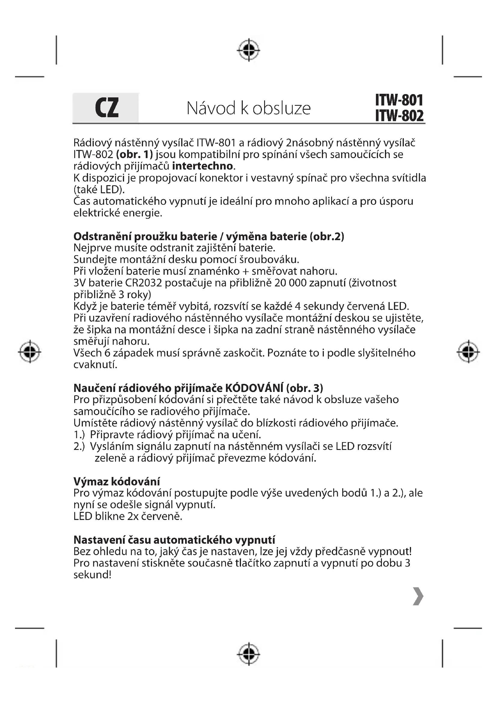 Ръководство за обслужване ITW-801 ITW-802Rádiový nástěnný vysílač ITW-801 a rádiový 2násobný nástěnný vysílač ITW-802 (obr. 1) jsou kompatibilní pro spínání všech samoučících se rádiových přijímačů intertechno. K dispozici je propojovací konektor i vestavný spínač pro všechna svítidla (také LED). Čas automatického vypnutí je ideální pro mnoho aplikací a pro úsporu elektrické energie. Odstranění proužku baterie / výměna baterie (obr.2) Nejprve musíte odstranit zajištění baterie. Sundejte montážní desku pomocí šroubováku. Při vložení baterie musí znaménko + směřovat nahoru. 3V baterie CR2032 postačuje na přibližně 20 000 zapnutí (životnost přibližně 3 roky) Když je baterie téměř vybitá, rozsvítí se každé 4 sekundy červená LED. Při uzavření radiového nástěnného vysílače montážní deskou se ujistěte, že šipka na montážní desce i šipka na zadní straně nástěnného vysílače směřují nahoru. Všech 6 západek musí správně zaskočit. Poznáte to i podle slyšitelného cvaknutí. Naučení rádiového přijímače KÓDOVÁNÍ (obr. 3) Pro přizpůsobení kódování si přečtěte také návod k obsluze vašeho samoučícího se radiového přijímače. Umístěte rádiový nástěnný vysílač do blízkosti rádiového přijímače. 1.) Připravte rádiový přijímač na učení. 2.) Vysláním signálu zapnutí na nástěnném vysílači se LED rozsvítí zeleně a rádiový přijímač převezme kódování. Výmaz kódování Pro výmaz kódování postupujte podle výše uvedených bodů 1.) a 2.), ale nyní se odešle signál vypnutí. LED blikne 2x červeně. Nastavení času automatického vypnutí Bez ohledu na to, jaký čas je nastaven, lze jej vždy předčasně vypnout! Pro nastavení stiskněte současně tlačítko zapnutí a vypnutí po dobu 3 sekund!