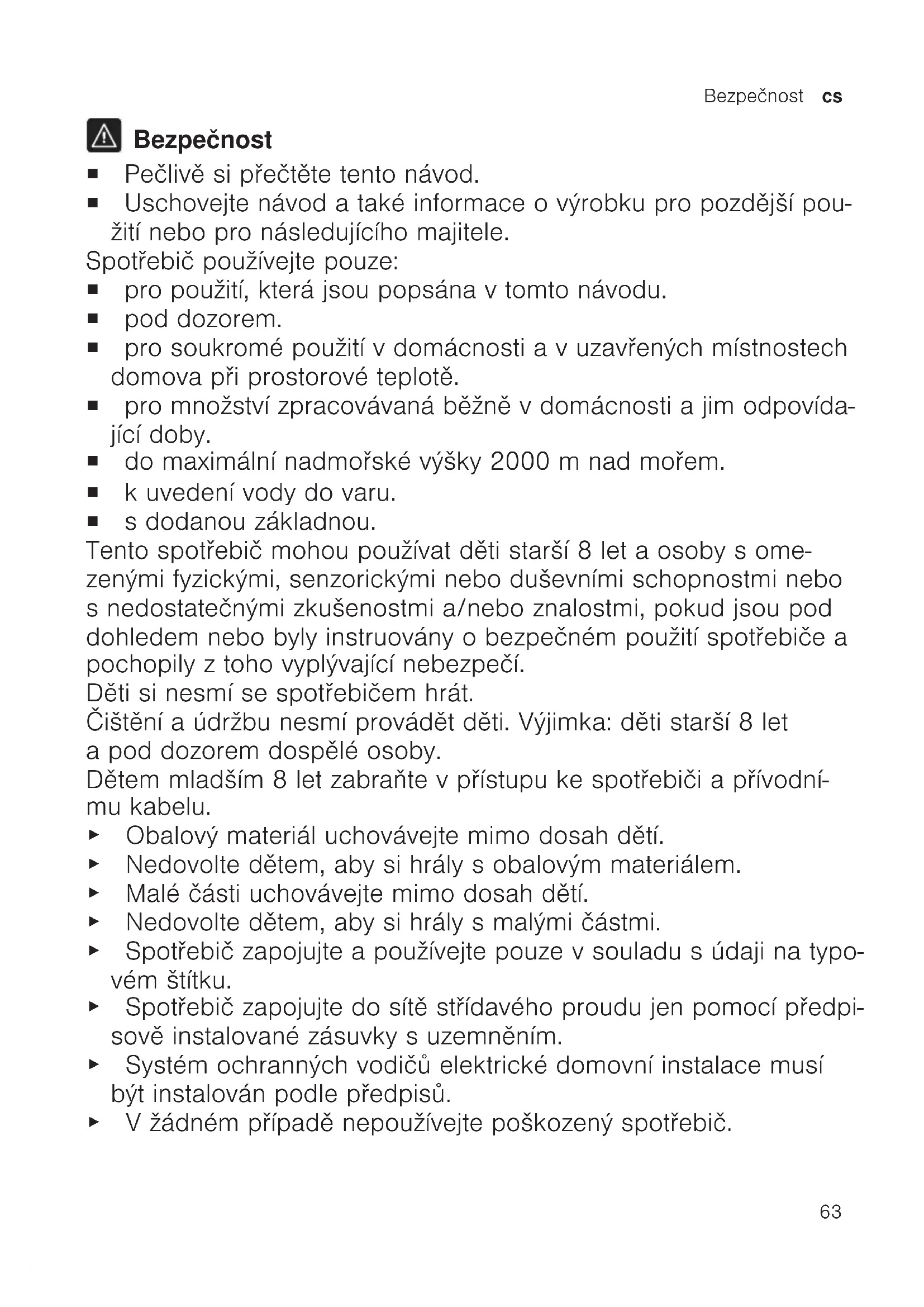 Bezpečnost ¡ Pečlivě si přečtěte tento návod. ¡ Uschovejte návod a také informace o výrobku pro pozdější pou- žití nebo pro následujícího majitele. Spotřebič používejte pouze: ¡ pro použití, která jsou popsána v tomto návodu. ¡ pod dozorem. ¡ pro soukromé použití v domácnosti a v uzavřených místnostech domova při prostorové teplotě. ¡ pro množství zpracovávaná běžně v domácnosti a jim odpovída- jící doby. ¡ do maximální nadmořské výšky 2000m nad mořem. ¡ k uvedení vody do varu. ¡ s dodanou základnou. Tento spotřebič mohou používat děti starší 8 let a osoby s ome- zenými fyzickými, senzorickými nebo duševními schopnostmi nebo s nedostatečnými zkušenostmi a/nebo znalostmi, pokud jsou pod dohledem nebo byly instruovány o bezpečném použití spotřebiče a pochopily z toho vyplývající nebezpečí. Děti si nesmí se spotřebičem hrát. Čištění aúdržbu nesmí provádět děti. Výjimka: děti starší 8let apod dozorem dospělé osoby. Dětem mladším 8let zabraňte vpřístupu ke spotřebiči apřívodní- mu kabelu. ▶ Obalový materiál uchovávejte mimo dosah dětí. ▶ Nedovolte dětem, aby si hrály sobalovým materiálem. ▶ Malé části uchovávejte mimo dosah dětí. ▶ Nedovolte dětem, aby si hrály smalými částmi. ▶ Spotřebič zapojujte apoužívejte pouze vsouladu súdaji na typo- vém štítku. ▶ Spotřebič zapojujte do sítě střídavého proudu jen pomocí předpi- sově instalované zásuvky suzemněním. ▶ Systém ochranných vodičů elektrické domovní instalace musí být instalován podle předpisů. ▶ Vžádném případě nepoužívejte poškozený spotřebič.cs Bezpečnost
