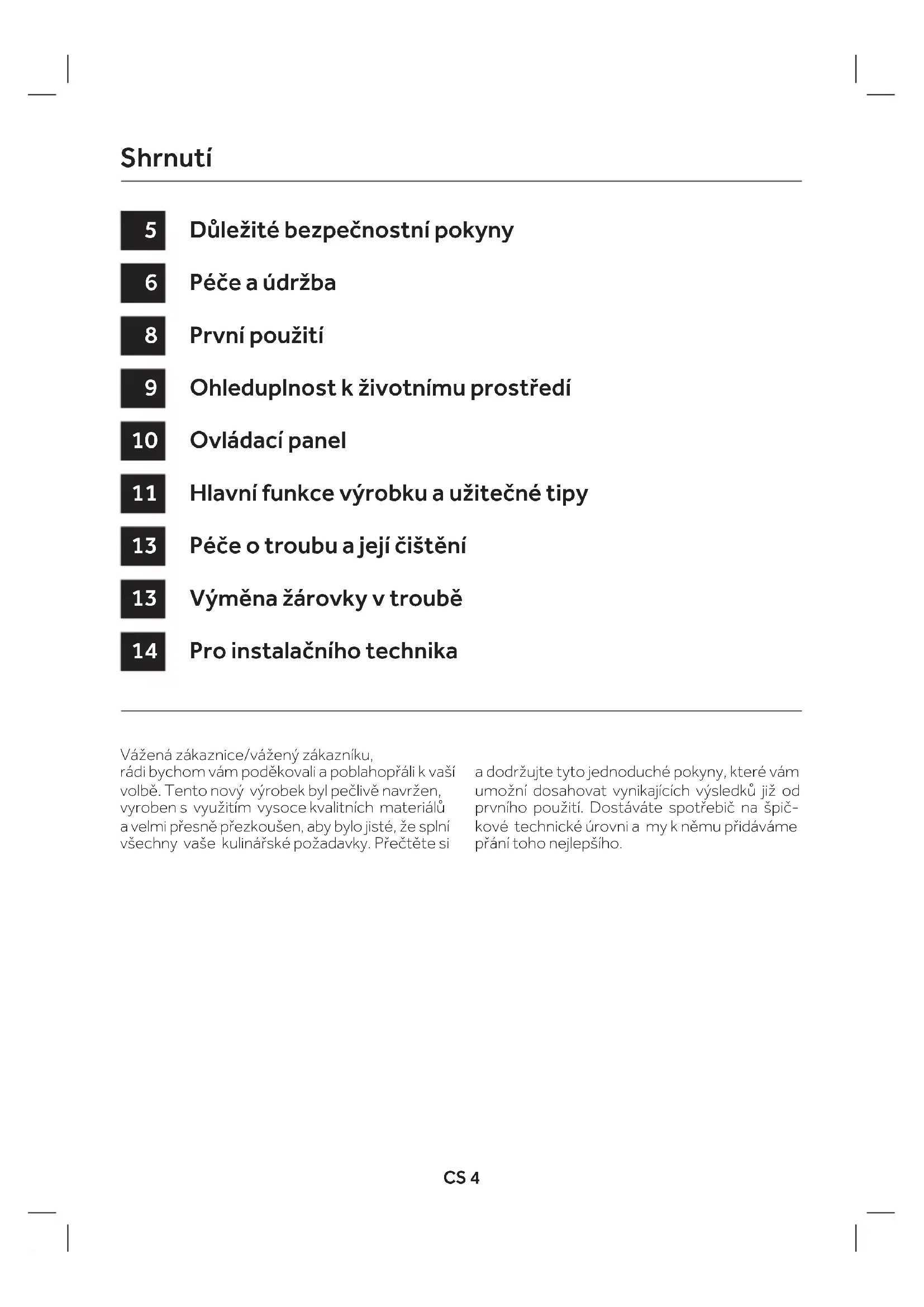 CANDY HOOVER GROUP Via Comolli 16 Brugherio – Italy User ManualUser Instructions OVENS 28EN Mode d’emploi FOURS 52FR Istruzioni per l’uso FORNI 64IT Bedienungsanleitung ÖFEN 16DE Instrucciones de uso HORNOS 40ES Instruções para o utilizador FORNOS 88PT Instrukcje użytkownika PIEKARNIKI 76PL Návod na použitie RÚRY 100SK Pokyny pro uživatele TROUBY 4CSCS 4 Vážená zákaznice/vážený zákazníku, rádi bychom vám poděkovali a poblahopřáli k vaší volbě. Tento nový výrobek byl pečlivě navržen, vyroben s využitím vysoce kvalitních materiálů avelmi přesně přezkoušen, aby bylo jisté, že splní všechny vaše kulinářské požadavky. Přečtěte si a dodržujte tyto jednoduché pokyny, které vám umožní dosahovat vynikajících výsledků již od prvního použití. Dostáváte spotřebič na špič- kové technické úrovni a my k němu přidáváme přání toho nejlepšího. Důležité bezpečnostní pokyny Péče a údržba První použití Ohleduplnost k životnímu prostředí Ovládací panel Hlavní funkce výrobku a užitečné tipy Péče o troubu a její čištění Výměna žárovky v troubě Pro instalačního technika