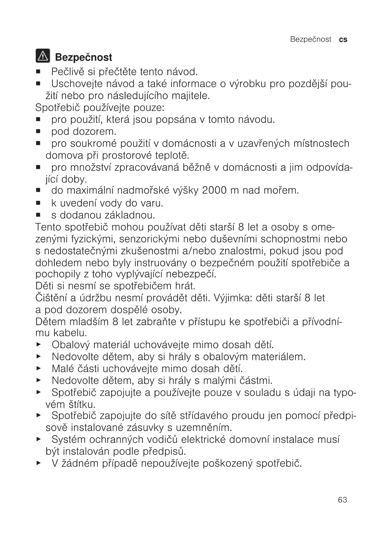 Bezpečnost ¡ Pečlivě si přečtěte tento návod. ¡ Uschovejte návod a také informace o výrobku pro pozdější pou- žití nebo pro následujícího majitele. Spotřebič používejte pouze: ¡ pro použití, která jsou popsána v tomto návodu. ¡ pod dozorem. ¡ pro soukromé použití v domácnosti a v uzavřených místnostech domova při prostorové teplotě. ¡ pro množství zpracovávaná běžně v domácnosti a jim odpovída- jící doby. ¡ do maximální nadmořské výšky 2000m nad mořem. ¡ k uvedení vody do varu. ¡ s dodanou základnou. Tento spotřebič mohou používat děti starší 8 let a osoby s ome- zenými fyzickými, senzorickými nebo duševními schopnostmi nebo s nedostatečnými zkušenostmi a/nebo znalostmi, pokud jsou pod dohledem nebo byly instruovány o bezpečném použití spotřebiče a pochopily z toho vyplývající nebezpečí. Děti si nesmí se spotřebičem hrát. Čištění aúdržbu nesmí provádět děti. Výjimka: děti starší 8let apod dozorem dospělé osoby. Dětem mladším 8let zabraňte vpřístupu ke spotřebiči apřívodní- mu kabelu. ▶ Obalový materiál uchovávejte mimo dosah dětí. ▶ Nedovolte dětem, aby si hrály sobalovým materiálem. ▶ Malé části uchovávejte mimo dosah dětí. ▶ Nedovolte dětem, aby si hrály smalými částmi. ▶ Spotřebič zapojujte apoužívejte pouze vsouladu súdaji na typo- vém štítku. ▶ Spotřebič zapojujte do sítě střídavého proudu jen pomocí předpi- sově instalované zásuvky suzemněním. ▶ Systém ochranných vodičů elektrické domovní instalace musí být instalován podle předpisů. ▶ Vžádném případě nepoužívejte poškozený spotřebič.cs Zabránění věcným škodám