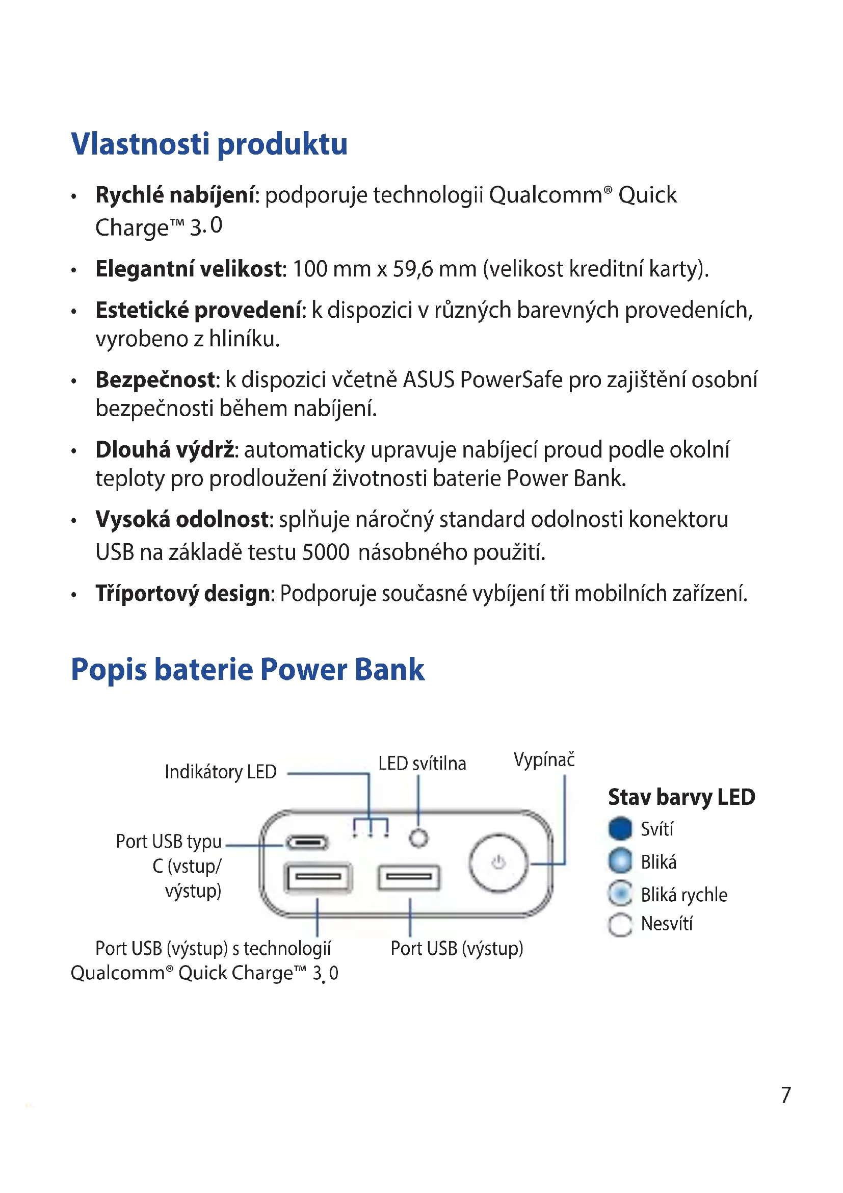 PortUSB(výstup) IndikátoryLED Vypínač LEDsvítilna Stav barvy LED Svítí Bliká Blikárychle Nesvítí8 Nabíjení baterie Power Bank Nabíjení zařízení z baterie Power Bank Indikace LED