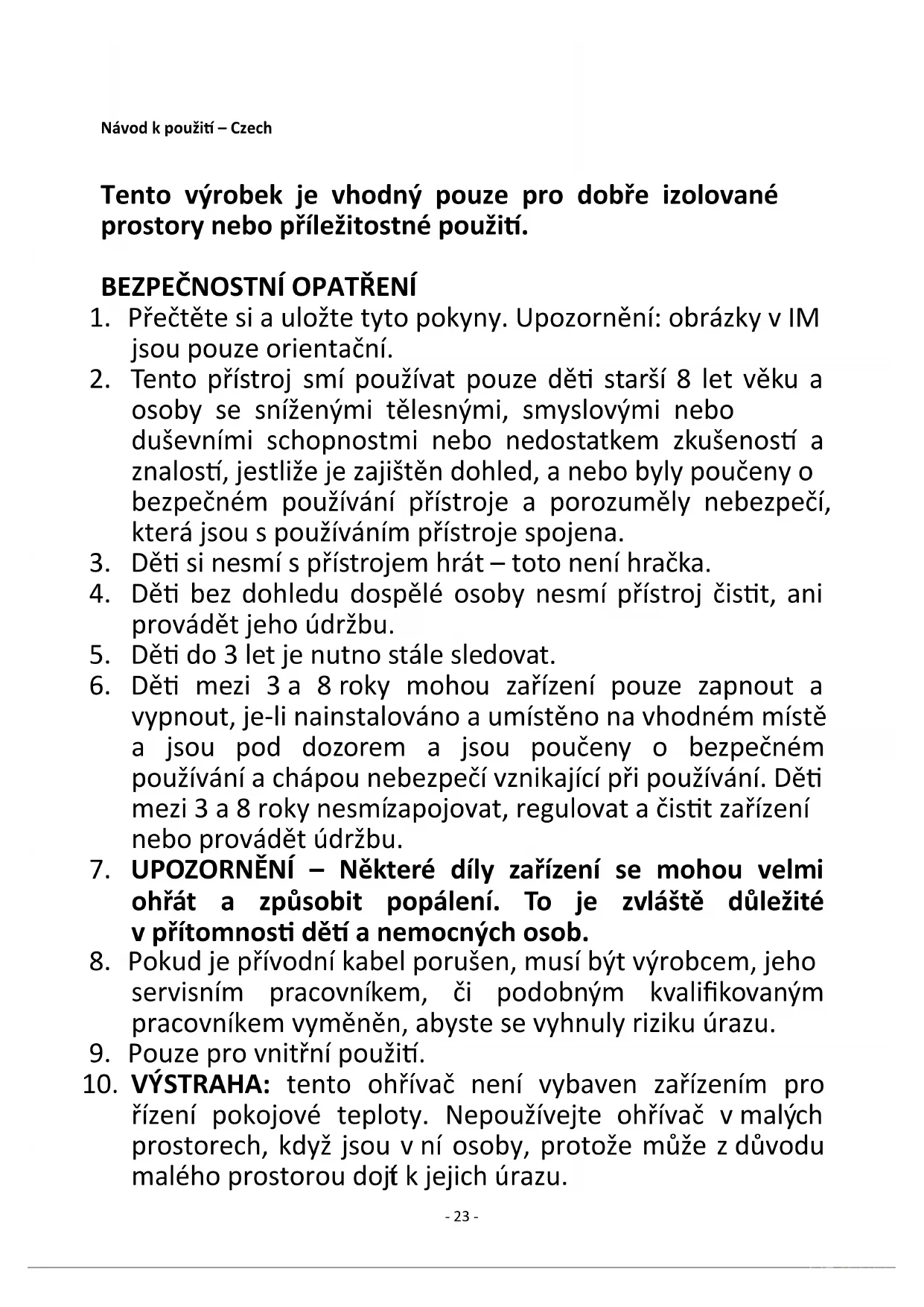 řízení pokojové teploty. Nepoužívejte ohřívač v malých prostorech, když jsou v ní osoby, protože může z důvodu malého prostorou dojít k jejich úrazu.- 24 -