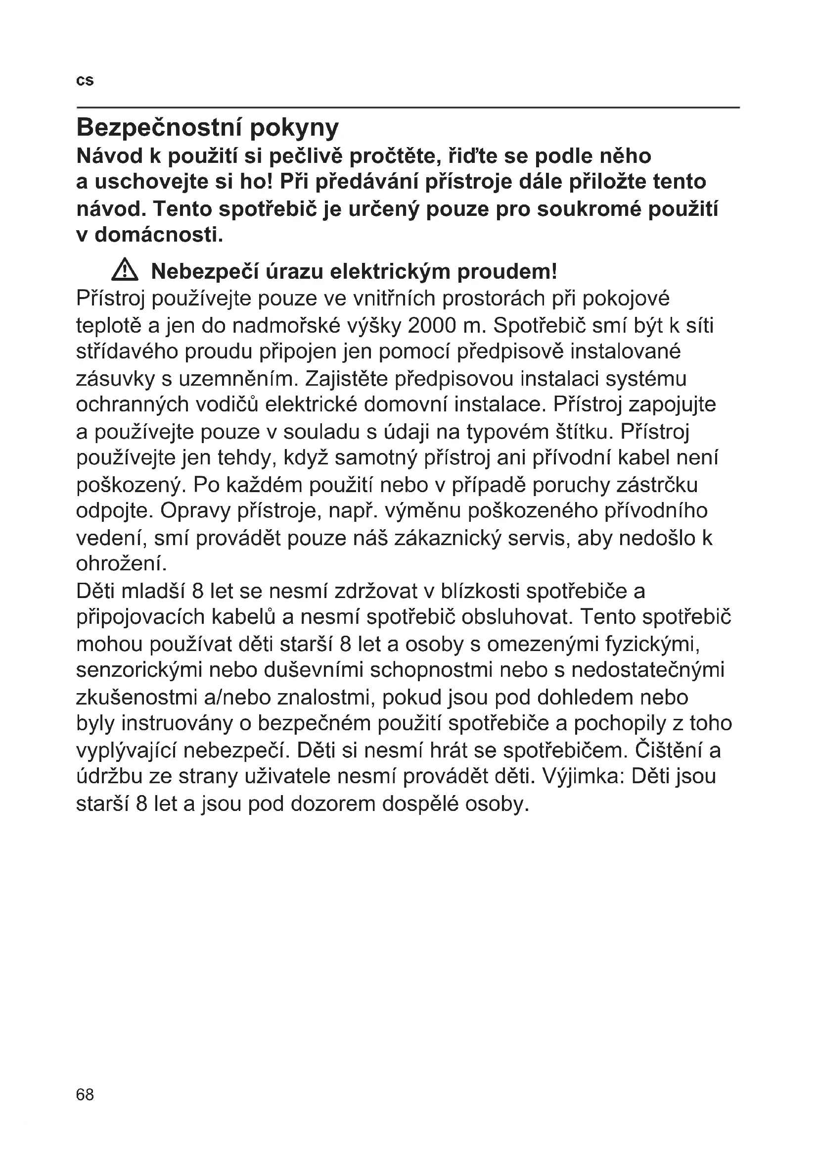 Bezpečnostní pokyny Návod k použití si pečlivě pročtěte, řiďte se podle něho a uschovejte si ho! Při předávání přístroje dále přiložte tento návod. Tento spotřebič je určený pouze pro soukromé použití v domácnosti. W Nebezpečí úrazu elektrickým proudem! Přístroj používejte pouze ve vnitřních prostorách při pokojové teplotě a jen do nadmořské výšky 2000 m. Spotřebič smí být k síti střídavého proudu připojen jen pomocí předpisově instalované zásuvky s uzemněním. Zajistěte předpisovou instalaci systému ochranných vodičů elektrické domovní instalace. Přístroj zapojujte a používejte pouze v souladu s údaji na typovém štítku. Přístroj používejte jen tehdy, když samotný přístroj ani přívodní kabel není poškozený. Po každém použití nebo v případě poruchy zástrčku odpojte. Opravy přístroje, např. výměnu poškozeného přívodního vedení, smí provádět pouze náš zákaznický servis, aby nedošlo k ohrožení. Děti mladší 8 let se nesmí zdržovat v blízkosti spotřebiče a připojovacích kabelů a nesmí spotřebič obsluhovat. Tento spotřebič mohou používat děti starší 8 let a osoby s omezenými fyzickými, senzorickými nebo duševními schopnostmi nebo s nedostatečnými zkušenostmi a/nebo znalostmi, pokud jsou pod dohledem nebo byly instruovány o bezpečném použití spotřebiče a pochopily z toho vyplývající nebezpečí. Děti si nesmí hrát se spotřebičem. Čištění a údržbu ze strany uživatele nesmí provádět děti. Výjimka: Děti jsou starší 8 let a jsou pod dozorem dospělé osoby.69