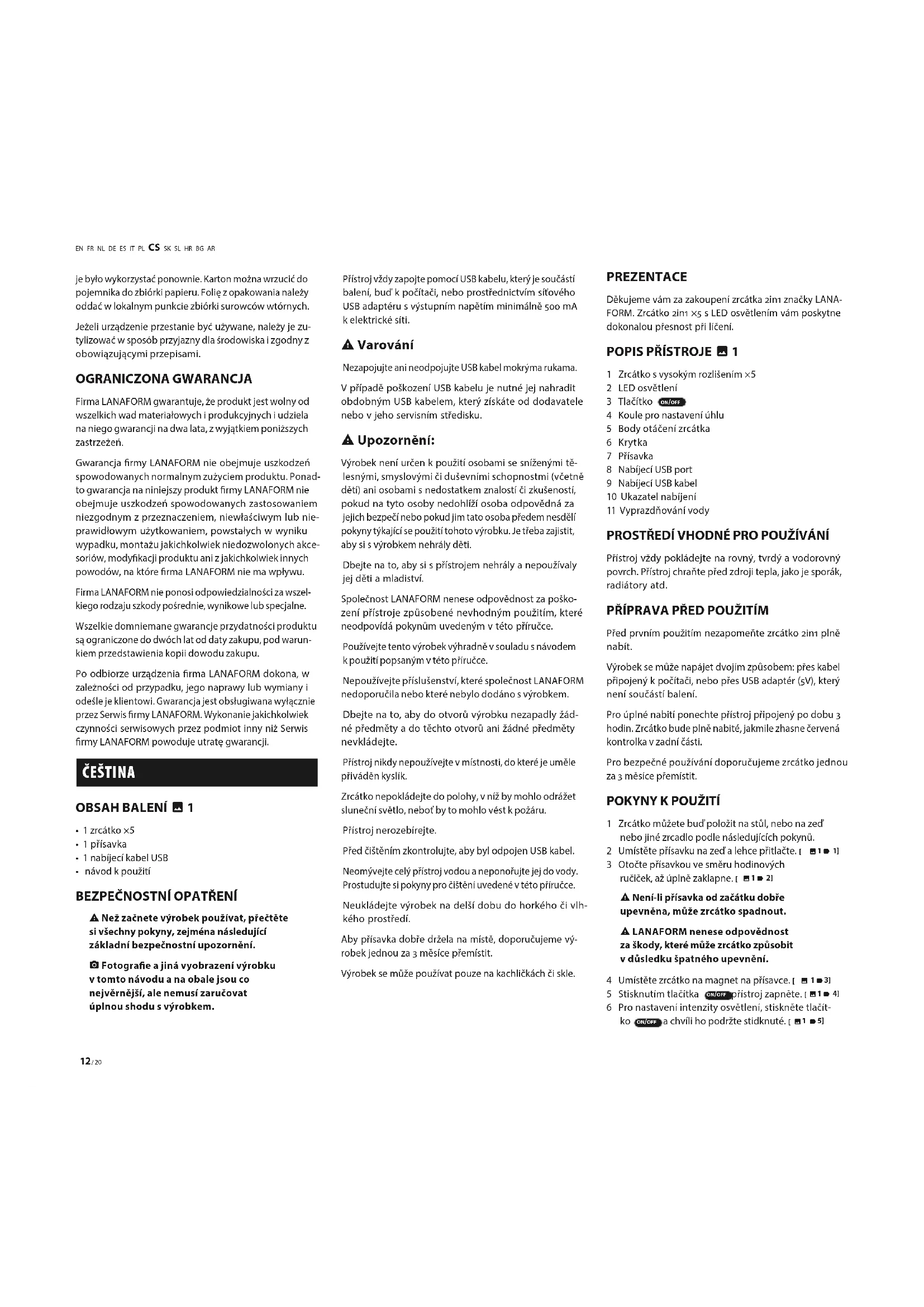 Upozornění: Výrobek není určen k použití osobami se sníženými tě- lesnými, smyslovými či duševními schopnostmi (včetně dětí) ani osobami s nedostatkem znalostí či zkušeností, pokud na tyto osoby nedohlíží osoba odpovědná za jejich bezpečí nebo pokud jim tato osoba předem nesdělí pokyny týkající se použití tohoto výrobku. Je třeba zajistit, aby si s výrobkem nehrály děti. Dbejte na to, aby si s přístrojem nehrály a nepoužívaly jej děti a mladiství. Společnost LANAFORM nenese odpovědnost za poško- zení přístroje způsobené nevhodným použitím, které neodpovídá pokynům uvedeným v této příručce. Používejte tento výrobek výhradně v souladu s návodem k použití popsaným v této příručce. Nepoužívejte příslušenství, které společnost LANAFORM nedoporučila nebo které nebylo dodáno s výrobkem. Dbejte na to, aby do otvorů výrobku nezapadly žád- né předměty a do těchto otvorů ani žádné předměty nevkládejte. Přístroj nikdy nepoužívejte v místnosti, do které je uměle přiváděn kyslík. Zrcátko nepokládejte do polohy, v níž by mohlo odrážet sluneční světlo, neboť by to mohlo vést k požáru. Přístroj nerozebírejte. Před čištěním zkontrolujte, aby byl odpojen USB kabel. Neomývejte celý přístroj vodou a neponořujte jej do vody. Prostudujte si pokyny pro čištění uvedené v této příručce. Neukládejte výrobek na delší dobu do horkého či vlh- kého prostředí. Aby přísavka dobře držela na místě, doporučujeme vý- robek jednou za měsíce přemístit. Výrobek se může používat pouze na kachličkách či skle. PREZENTACE Děkujeme vám za zakoupení zrcátka in značky LANA- FORM. Zrcátko in × s LED osvětlením vám poskytne dokonalou přesnost při líčení.