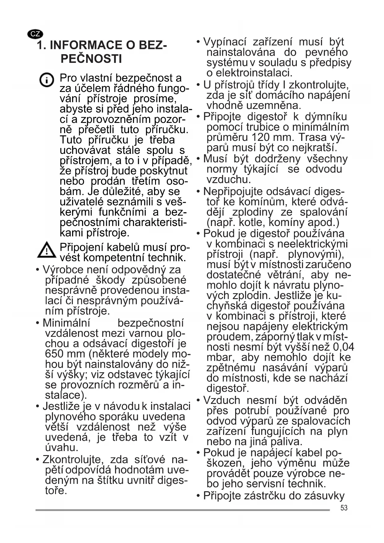 - Pokud je digestoř používána v kombinaci s neelektrickými přístroji (např. plynovými), musí být v místnosti zaručeno dostatečné větrání, aby ne- mohlo dojít k návratu plyno- vých zplodin. Jestliže je ku- chyňská digestoř používána v kombinaci s přístroji, které nejsou napájeny elektrickým proudem, záporný tlak v míst- nosti nesmí být vyšší než 0,04 mbar, aby nemohlo dojít ke zpětnému nasávání výparů do místnosti, kde se nachází digestoř.