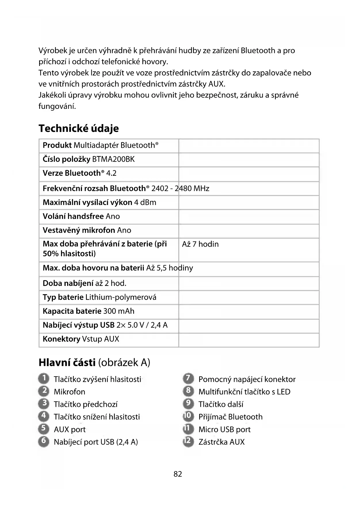 Rychlý návod Multiadaptér Bluetooth® BTMA200BK Více informací najdete v rozšířené příručce online: ned.is/btma200bk Zamýšlené použití BTMA200BK značky Nedis je určen k použití jako hands-free sada s funkcí Bluetooth. Tento výrobek disponuje vestavěným mikrofonem pro hands-free telefonické hovory a integrovanými nabíjecími porty USB, které slouží k nabíjení libovolných zařízení.Výrobek je určen pouze k použití uvnitř vozu a ve vnitřních prostorách.Výrobek není určen k profesionálnímu použití.82 Výrobek je určen výhradně k přehrávání hudby ze zařízení Bluetooth a pro příchozí i odchozí telefonické hovory. Tento výrobek lze použít ve voze prostřednictvím zástrčky do zapalovače nebo ve vnitřních prostorách prostřednictvím zástrčky AUX. Jakékoli úpravy výrobku mohou ovlivnit jeho bezpečnost, záruku a správné fungování. Technické údaje Produkt Multiadaptér Bluetooth® Číslo položky BTMA200BK Verze Bluetooth® 4.2 Frekvenční rozsah Bluetooth® 2402 - 2480 MHz Maximální vysílací výkon 4 dBm Volání handsfree Ano Vestavěný mikrofon Ano Max doba přehrávání zbaterie (při 50% hlasitosti) Až 7 hodin Max. doba hovoru na baterii Až 5,5 hodiny Doba nabíjení až 2 hod. Typ baterie Lithium-polymerová Kapacita baterie 300 mAh Nabíjecí výstup USB 2× 5.0 V / 2,4 A Konektory Vstup AUX Hlavní části (obrázek A)