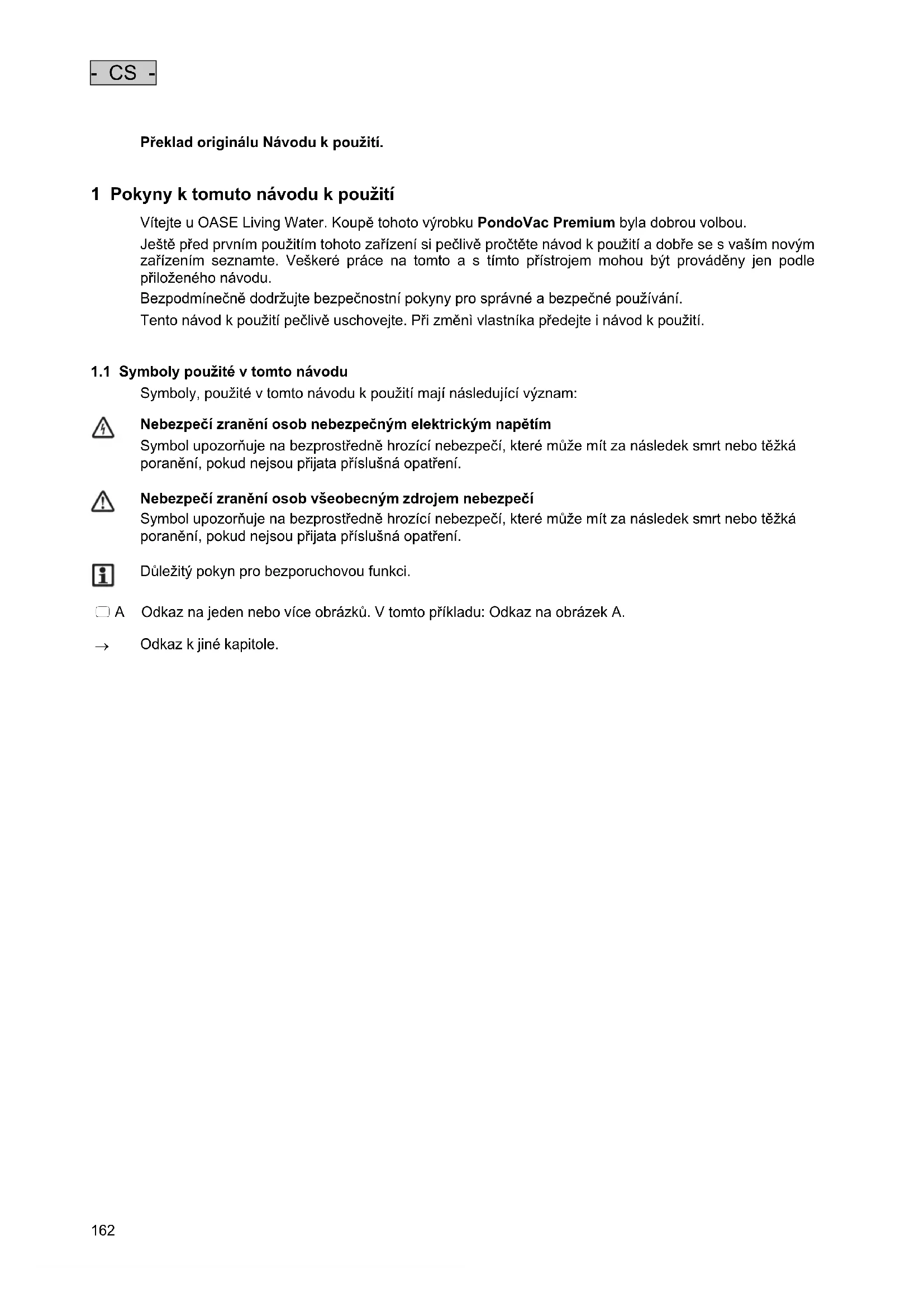 1 Pokyny k tomuto návodu k použití Vítejte u OASE Living Water. Koupě tohoto výrobku PondoVac Premium byla dobrou volbou. Ještě před prvním použitím tohoto zařízení si pečlivě pročtěte návod k použití a dobře se s vaším novým zařízením seznamte. Veškeré práce na tomto a s tímto přístrojem mohou být prováděny jen podle přiloženého návodu. Bezpodmínečně dodržujte bezpečnostní pokyny pro správné a bezpečné používání. Tento návod k použití pečlivě uschovejte. Při změnì vlastníka předejte i návod k použití.