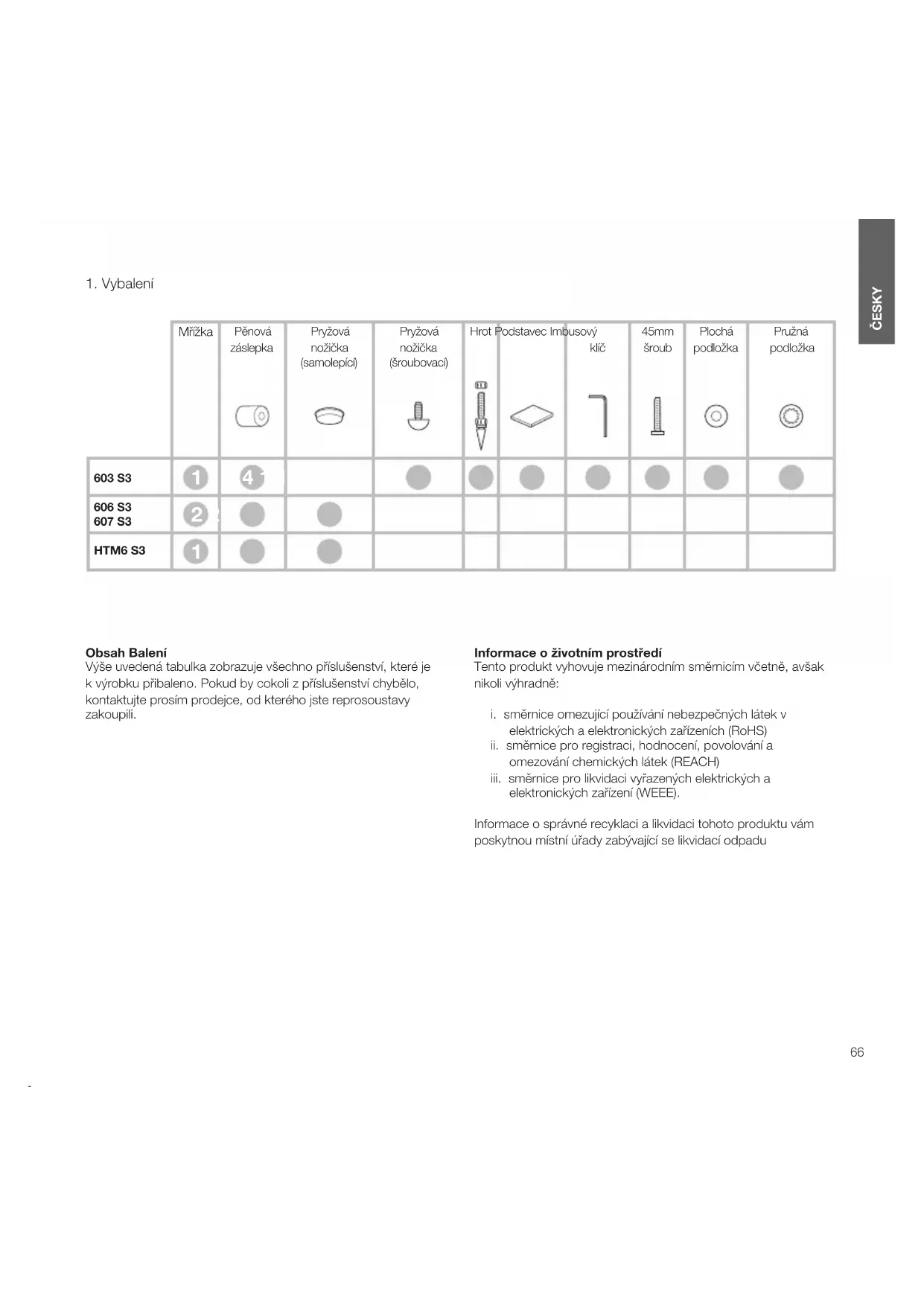Mřížka Pěnová záslepkaPryžová nožička (samolepící)Pryžová nožička (šroubovací)Hrot Podstavec Imbusový klíč 45mm šroubPlochá podložkaPružná podložka603 S3 606 S3607 S3 HTM6 S3