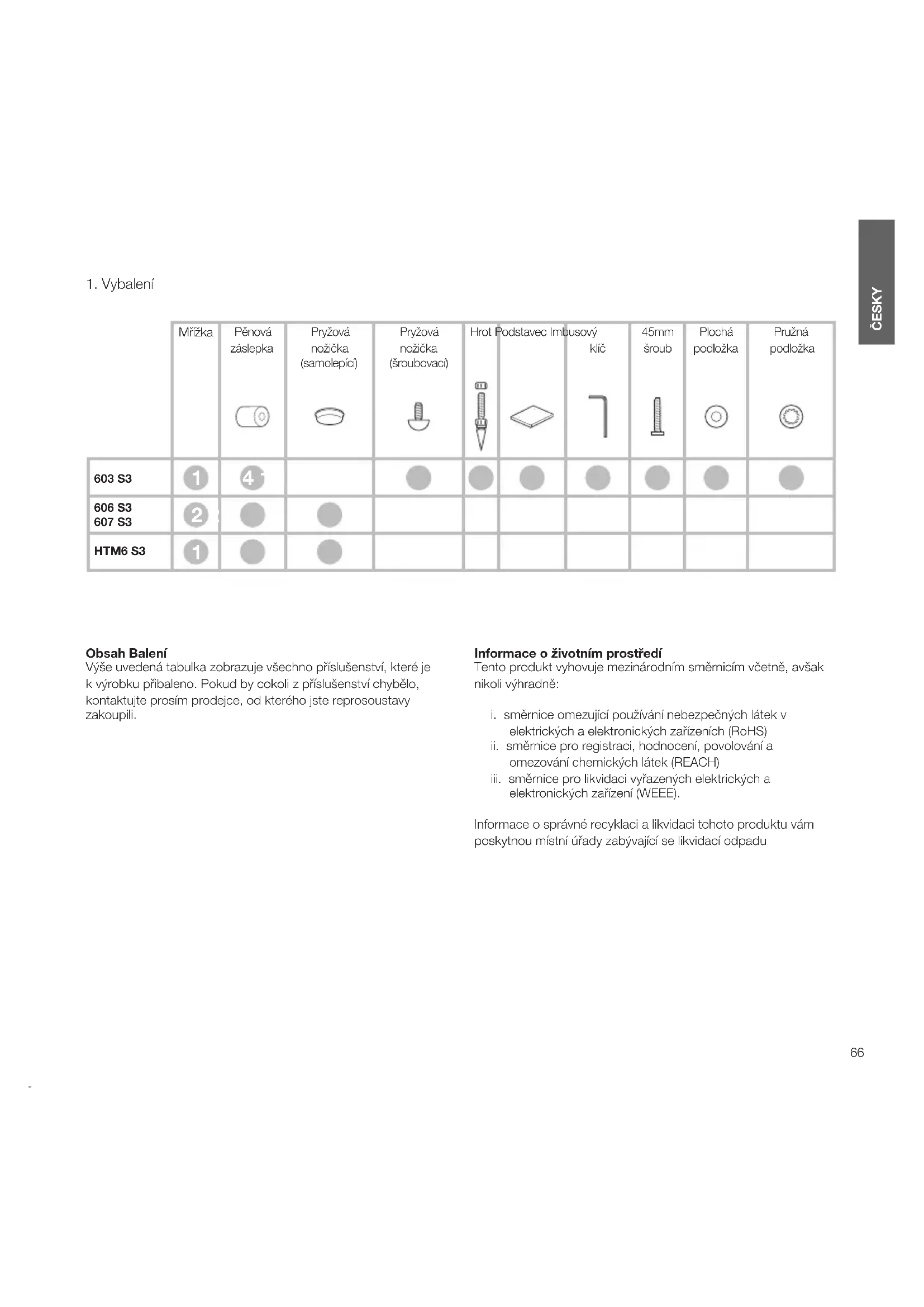 ČESKY Obsah Balení Výše uvedená tabulka zobrazuje všechno příslušenství, které je k výrobku přibaleno. Pokud by cokoli z příslušenství chybělo, kontaktujte prosím prodejce, od kterého jste reprosoustavy zakoupili. Informace o životním prostředí Tento produkt vyhovuje mezinárodním směrnicím včetně, avšak nikoli výhradně: