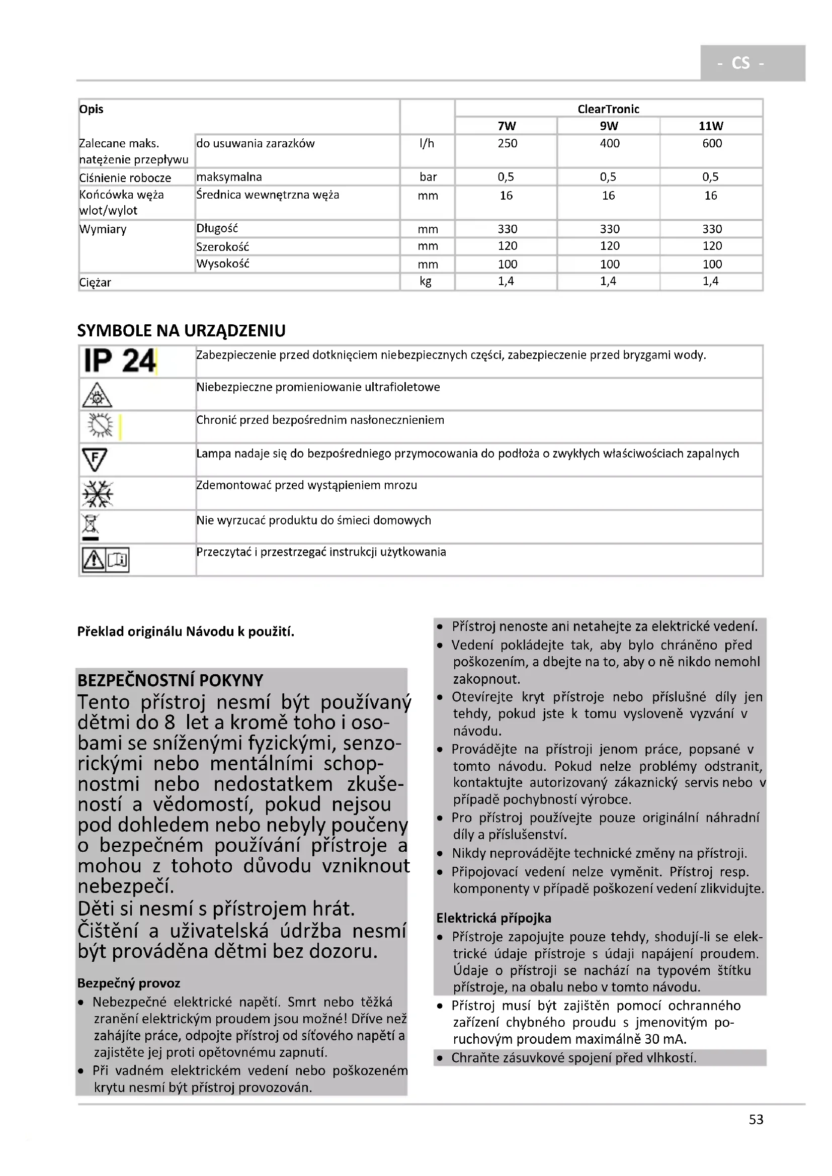 Popis funkcí Speciální světelné záření UVC čističe odstraňuje vznášející se řasy a jiné kalicí látky, které způsobují zelenou vodu. Navíc se ničí bakterie a zárodky. UVC či- stič se zabuduje do vodního okruhu, ideálně před filtr. Použití v souladu s určeným účelem ClearTronic 7 W / 9 W / 11 W, dále jen přístroj, se smí používat výhradně podle níže uvedených pokynů: