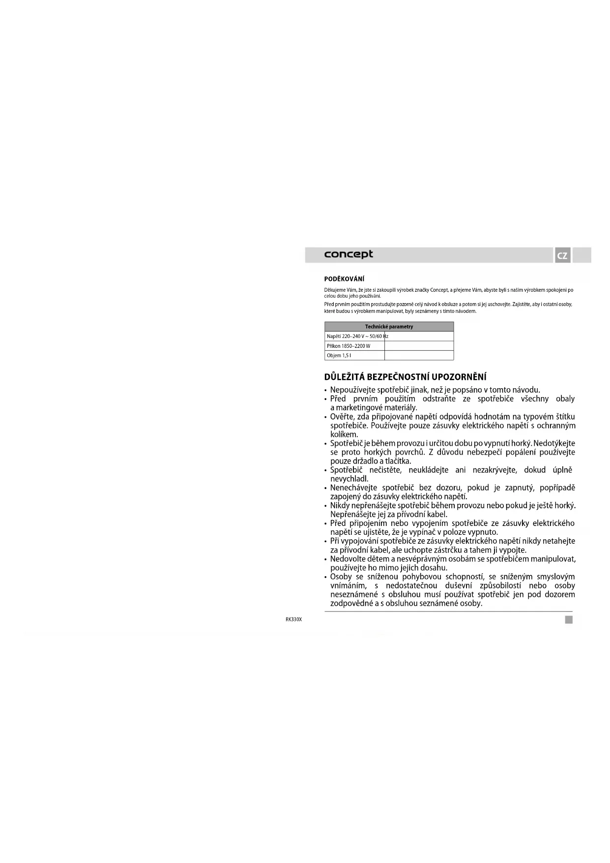 Děkujeme Vám, že jste si zakoupili výrobek značky Concept, a přejeme Vám, abyste byli s naším výrobkem spokojeni po celou dobu jeho používání. Před prvním použitím prostudujte pozorně celý návod k obsluze a potom si jej uschovejte. Zajistěte, aby i ostatní osoby, které budou s výrobkem manipulovat, byly seznámeny s tímto návodem. Technické parametry Napětí 220–240 V ~ 50/60 Hz Příkon 1850–2200 W Objem 1,5 l DŮLEŽITÁ BEZPEČNOSTNÍ UPOZORNĚNÍ
