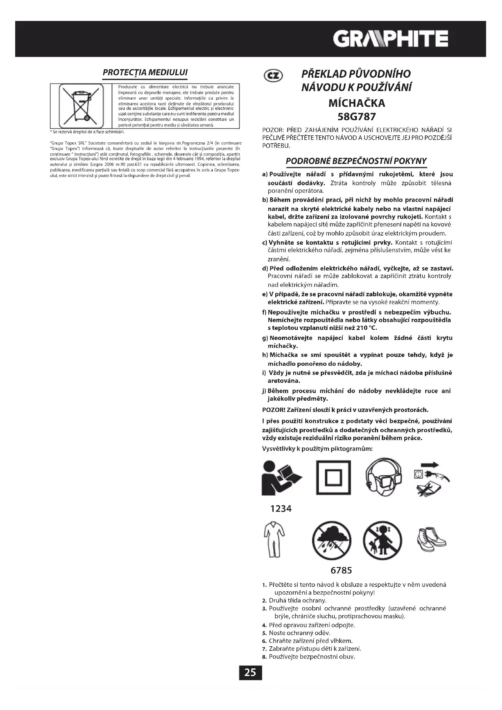Elektricky napájené výrobky nevyhazujte spolu s domácím odpadem, nýbrž je odevzdejte k likvidaci v příslušných závodech pro zpracování odpadu. Informace ohledně likvidace Vám poskytne prodejce nebo místní úřady. Použitá elektrická a elektronická zařízení obsahují látky škodlivé pro životní prostředí. Nerecyklovaná zařízení představují potenciální nebezpečí pro životní prostředí a zdraví osob.* Právo na provádění změn je vyhrazeno.„Grupa Topex Spółka z ograniczoną odpowiedzialnością” Spółka komandytowa se sídlem ve Varšavě, na ul. Pograniczna 2/4 (dále jen: „Grupa Topex”) informuje, že veškerá autorská práva k obsahu tohoto návodu (dále jen: „návod”), včetně m.j. textu, použitých fotografií, schémat, výkresů a také jeho uspořádání, náleží výhradně firmě Grupa Topex a jsou právně chráněna podle zákona ze dne 4. února 1994, o autorských právech a právech příbuzných (sbírka zákonů z roku 2006 č. 90 položka 631 s pozdějšími změnami). Kopírování, zpracovávání, zveřejňování či modifikování celého návodu jakož i jeho jednotlivých částí pro komerční účely bez písemného souhlasu firmy Grupa Topex je přísně zakázáno a může mít za následek občanskoprávní a trestní stíhání.