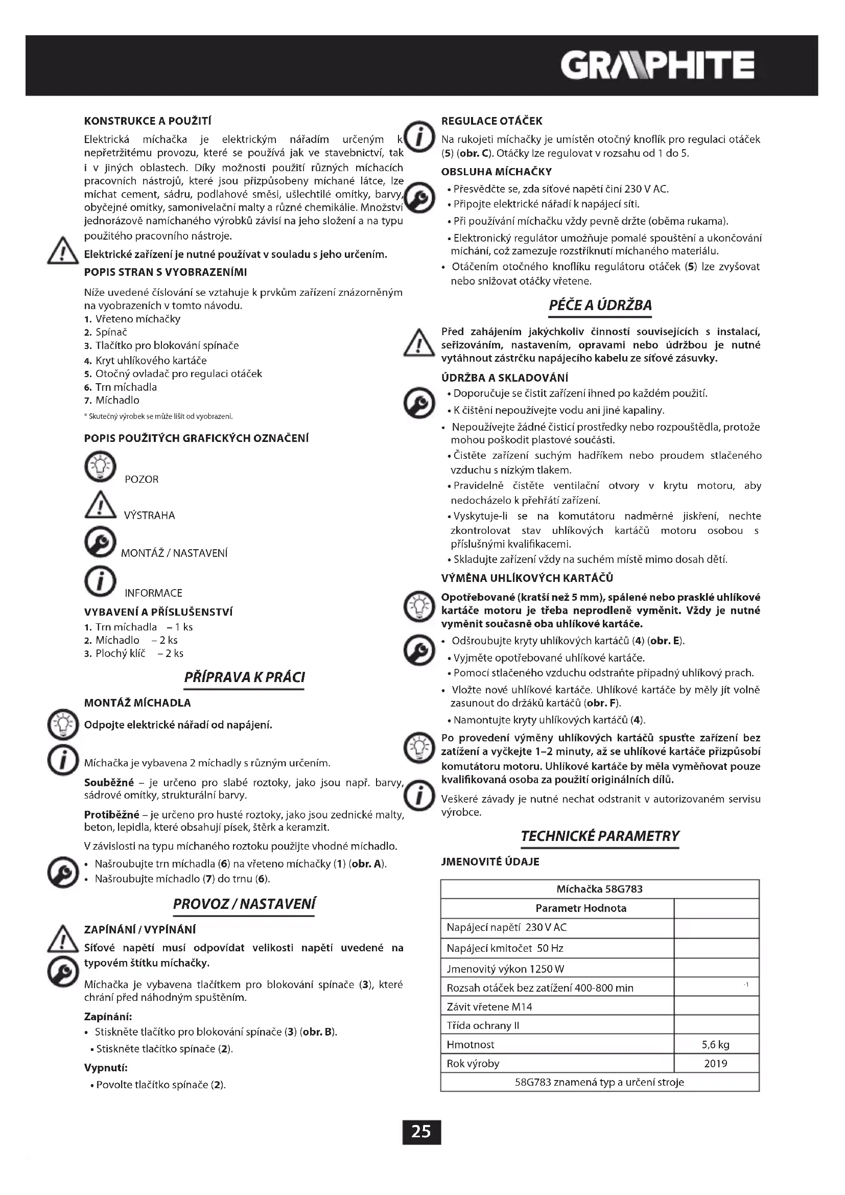 - Namontujte kryty uhlíkových kartáčů (4). Po provedení výměny uhlíkových kartáčů spusťte zařízení bez zatížení a vyčkejte 1–2 minuty, až se uhlíkové kartáče přizpůsobí komutátoru motoru. Uhlíkové kartáče by měla vyměňovat pouze kvalifikovaná osoba za použití originálních dílů. Veškeré závady je nutné nechat odstranit v autorizovaném servisu výrobce. TECHNICKÉ PARAMETRY JMENOVITÉ ÚDAJE Míchačka 58G783 Parametr Hodnota Napájecí napětí 230 V AC Napájecí kmitočet 50 Hz Jmenovitý výkon 1250 W Rozsah otáček bez zatížení 400-800 min
