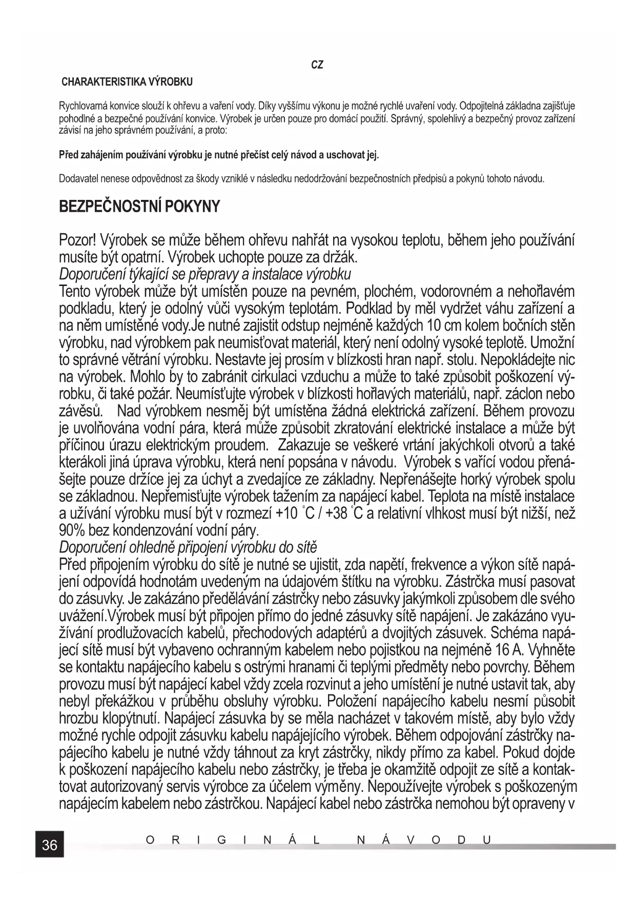 Rychlovarná konvice slouží k ohřevu a vaření vody. Díky vyššímu výkonu je možné rychlé uvaření vody. Odpojitelná základna zajišťuje pohodlné a bezpečné používání konvice. Výrobek je určen pouze pro domácí použití. Správný, spolehlivý a bezpečný provoz zařízení závisí na jeho správném používání, a proto: Před zahájením používání výrobku je nutné přečíst celý návod a uschovat jej. Dodavatel nenese odpovědnost za škody vzniklé v následku nedodržování bezpečnostních předpisů a pokynů tohoto návodu.