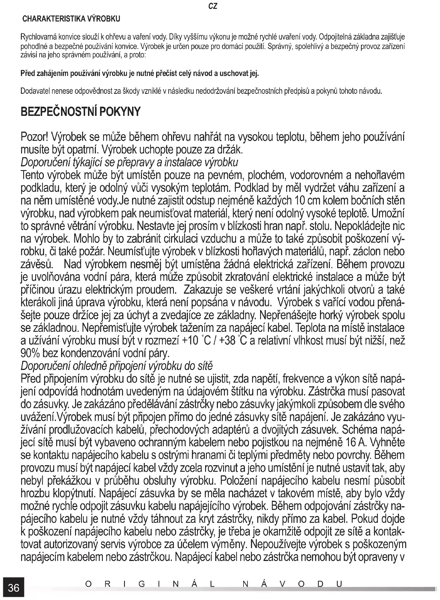 Pozor! Výrobek se může během ohřevu nahřát na vysokou teplotu, během jeho používání musíte být opatrní. Výrobek uchopte pouze za držák. Doporučení týkající se přepravy a instalace výrobku Tento výrobek může být umístěn pouze na pevném, plochém, vodorovném a nehořlavém podkladu, který je odolný vůči vysokým teplotám. Podklad by měl vydržet váhu zařízení a na něm umístěné vody.Je nutné zajistit odstup nejméně každých 10 cm kolem bočních stěn výrobku, nad výrobkem pak neumisťovat materiál, který není odolný vysoké teplotě. Umožní to správné větrání výrobku. Nestavte jej prosím v blízkosti hran např. stolu. Nepokládejte nic na výrobek. Mohlo by to zabránit cirkulaci vzduchu a může to také způsobit poškození vý- robku, či také požár. Neumísťujte výrobek v blízkosti hořlavých materiálů, např. záclon nebo závěsů. Nad výrobkem nesměj být umístěna žádná elektrická zařízení. Během provozu je uvolňována vodní pára, která může způsobit zkratování elektrické instalace a může být příčinou úrazu elektrickým proudem. Zakazuje se veškeré vrtání jakýchkoli otvorů a také kterákoli jiná úprava výrobku, která není popsána v návodu. Výrobek s vařící vodou přená- šejte pouze držíce jej za úchyt a zvedajíce ze základny. Nepřenášejte horký výrobek spolu se základnou. Nepřemisťujte výrobek tažením za napájecí kabel. Teplota na místě instalace a užívání výrobku musí být v rozmezí +10