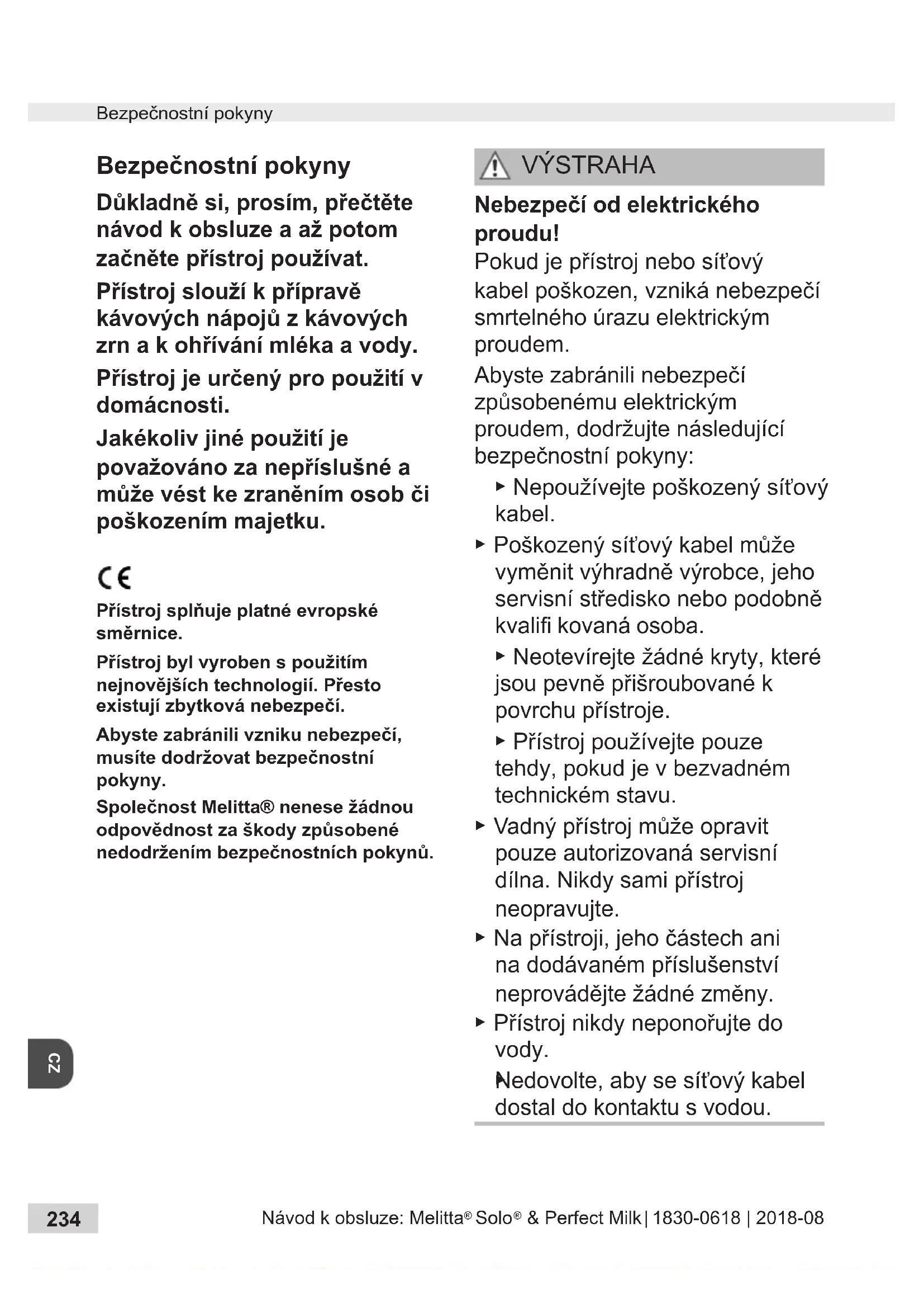 Bezpečnostní pokyny Důkladně si, prosím, přečtěte návod k obsluze a až potom začněte přístroj používat. Přístroj slouží k přípravě kávových nápojů z kávových zrn a k ohřívání mléka a vody. Přístroj je určený pro použití v domácnosti. Jakékoliv jiné použití je považováno za nepříslušné a může vést ke zraněním osob či poškozením majetku. Přístroj splňuje platné evropské směrnice. Přístroj byl vyroben s použitím nejnovějších technologií. Přesto existují zbytková nebezpečí. Abyste zabránili vzniku nebezpečí, musíte dodržovat bezpečnostní pokyny. Společnost Melitta® nenese žádnou odpovědnost za škody způsobené nedodržením bezpečnostních pokynů. VÝSTRAHA Nebezpečí od elektrického proudu! Pokud je přístroj nebo síťový kabel poškozen, vzniká nebezpečí smrtelného úrazu elektrickým proudem. Abyste zabránili nebezpečí způsobenému elektrickým proudem, dodržujte následující bezpečnostní pokyny: ▶ Nepoužívejte poškozený síťový kabel. ▶ Poškozený síťový kabel může vyměnit výhradně výrobce, jeho servisní středisko nebo podobně kvalifi kovaná osoba. ▶ Neotevírejte žádné kryty, které jsou pevně přišroubované k povrchu přístroje. ▶ Přístroj používejte pouze tehdy, pokud je v bezvadném technickém stavu. ▶ Vadný přístroj může opravit pouze autorizovaná servisní dílna. Nikdy sami přístroj neopravujte. ▶ Na přístroji, jeho částech ani na dodávaném příslušenství neprovádějte žádné změny. ▶ Přístroj nikdy neponořujte do vody.
