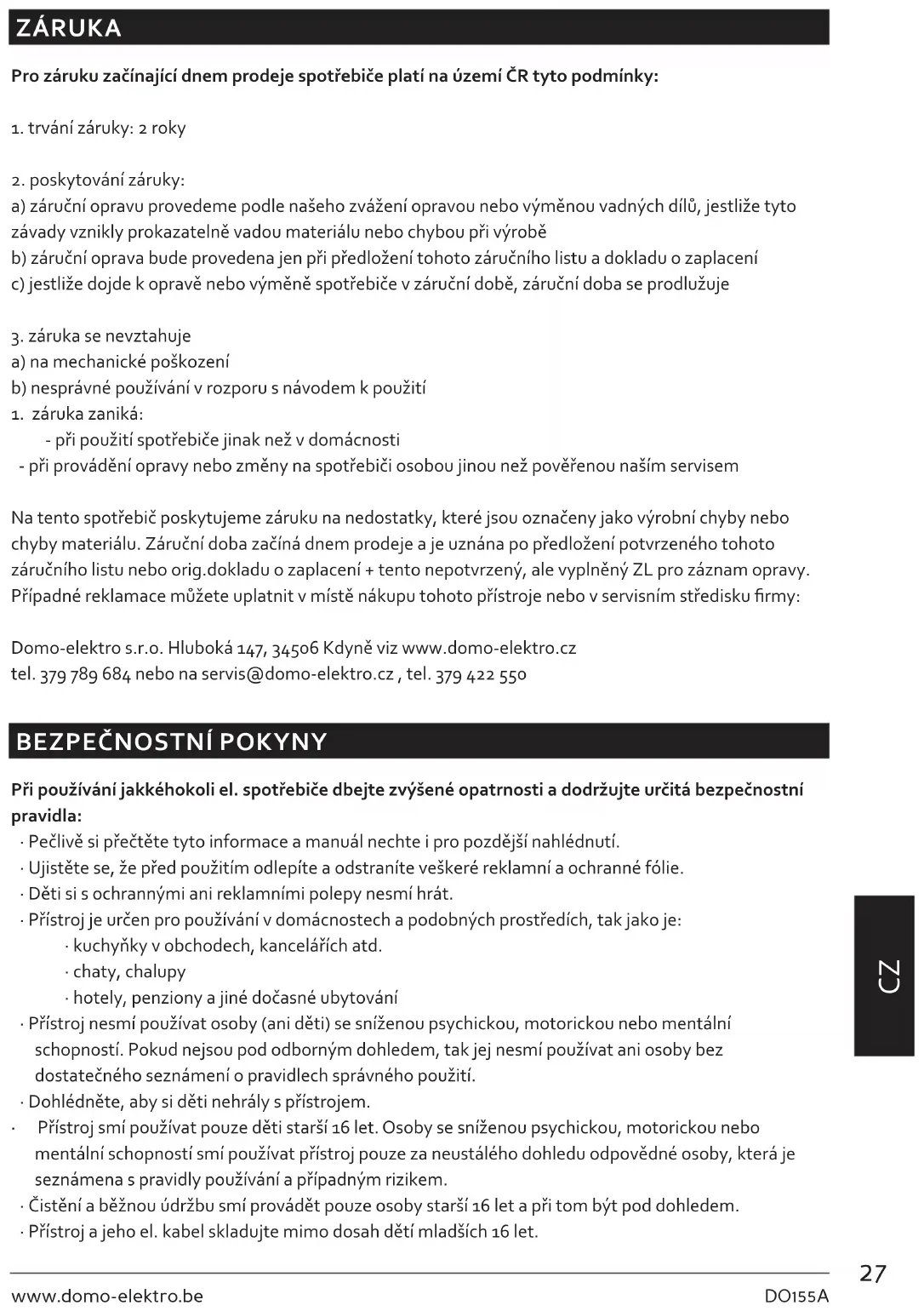 - při použití spotřebiče jinak než v domácnosti - při provádění opravy nebo změny na spotřebiči osobou jinou než pověřenou naším servisem Na tento spotřebič poskytujeme záruku na nedostatky, které jsou označeny jako výrobní chyby nebo chyby materiálu. Záruční doba začíná dnem prodeje a je uznána po předložení potvrzeného tohoto záručního listu nebo orig.dokladu o zaplacení + tento nepotvrzený, ale vyplněný ZL pro záznam opravy. Případné reklamace můžete uplatnit v místě nákupu tohoto přístroje nebo v servisním středisku rmy: Domo-elektro s.r.o. Hluboká 147, 34506 Kdyně viz www.domo-elektro.cz tel. 379 789 684 nebo na servis@domo-elektro.cz , tel. 379 422 550