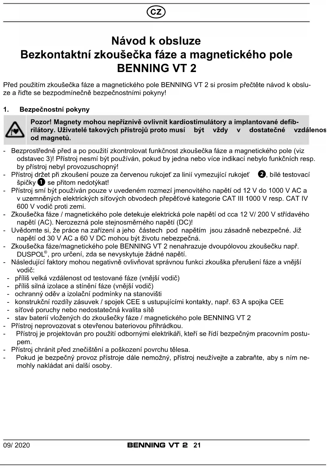 , pro určení, zda se nevyskytuje žádné napětí. - Následující faktory mohou negativně ovlivňovat správnou funkci zkouška přerušení fáze a vnější vodič: - příliš velká vzdálenost od testované fáze (vnější vodič) - příliš silná izolace a stínění fáze (vnější vodič) - ochranný oděv a izolační podmínky na stanovišti - konstrukční rozdíly zásuvek / spojek CEE s ustupujícími kontakty, např. 63 A spojka CEE - síťové poruchy nebo nedostatečná kvalita sítě - stav baterií vložených do zkoušečky fáze / magnetického pole BENNING VT 2 - Přístroj neprovozovat s otevřenou bateriovou přihrádkou. - Přístroj je projektován pro použití odbornými elektrikáři, kteří se řídí bezpečným pracovním postu- pem. - Přístroj chránit před znečištění a poškození povrchu tělesa. - Pokud je bezpečný provoz přístroje dále nemožný, přístroj neužívejte a zabraňte, aby s ním ne- mohly nakládat ani další osoby.09/ 2020 BENNING VT 2 22 Elektrické symboly na přístroji:Symbol VýznamPozor! Magnety mohou nepříznivě ovlivnit kardiostimulátory a implantované debri-látory. Uživatelé takových přístrojů proto musí být vždy v dostatečné vzdálenosti od magnetů. Pozor, řídit se dokumentací!Tento symbol znamená, že pro eliminaci nebezpečí je nutno se řídit pokyny v návodu k použití.Tento symbol znamená, že BENNING VT 2 má ochranné izolační provedení (třída ochrany II).Dodržujte návod k použití.Tento symbol na přístroji BENNING VT 2 znamená, že je přístroj BENNING VT 2 v souladu se směrnicemi EU. AC střídavé napětí Země (napětí proti zemi)Tento symbol označuje správný směr vložení baterií podle pólů.2. Popispřístroje(obr. A) TestovacíšpičkasindikátoremLED (červená/ zelená) Linievymezujícírukojeť