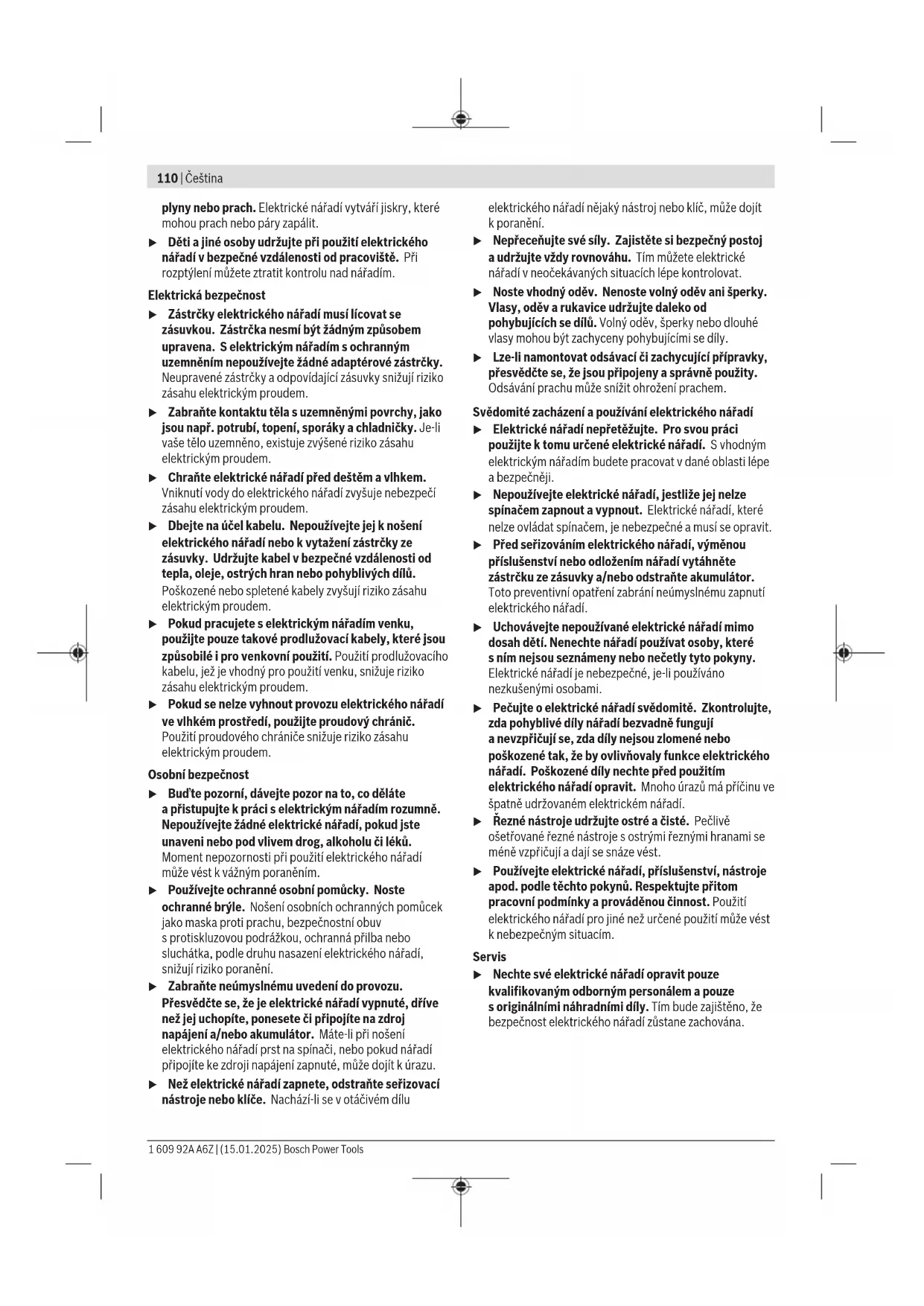 Zabezpieczenie przed odrzutem W przypadku nagłego odrzutu elektronarzę- dzia, spowodowanego np. zablokowaniem się osprzętu w materiale podczas frezowania, sys- tem elektroniczny odcina zasilanie i wyłącza silnik. W celu ponownego włączenia elektronarzędzia należy usta- wić włącznik/wyłącznik(5)/(11) w pozycji wyłączonej i po- nownie włączyć elektronarzędzie. Zabezpieczenie przed ponownym rozruchem Zabezpieczenie przed ponownym rozruchem zapobiega sa- moczynnemu włączeniu się elektronarzędzia po przerwie w dopływie prądu. W celu ponownego włączenia elektronarzędzia należy usta- wić włącznik/wyłącznik(5)/(11) w pozycji wyłączonej i po- nownie włączyć elektronarzędzie. Wskazówka: Szybkie wyłączenie i ponowne włączenie elek- tronarzędzia może spowodować, iż zabezpieczenie przed ponownym rozruchem nie zadziała pomimo naciśniętego włącznika/wyłącznika(5)/(11). Włącznik/wyłącznik(5)/ (11) należy ustawić w pozycji wyłączonej, a następnie po- nownie włączyć elektronarzędzie. System łagodnego rozruchu Elektroniczny system łagodnego rozruchu ogranicza moment obrotowy podczas włączania i wydłuża żywotność silnika. Wskazówki dotyczące pracy u Przed przystąpieniem do jakichkolwiek prac przy elektronarzędziu należy wyjąć wtyczkę z gniazda. 1 609 92A A6Z | (15.01.2025) Bosch Power ToolsČeština | 109 u Narzędzia szlifierskie należy przechowywać tak, aby były one chronione przed wstrząsami i uderzeniami. u Elektronarzędzia nie należy przeciążać do tego stop- nia, że zatrzyma się ono samoczynnie. u Po silnym obciążeniu elektronarzędzia, należy pozwo- lić mu pracować przez parę minut na biegu jałowym, w celu ochłodzenia narzędzia roboczego. u Ściernice rozgrzewają się podczas obróbki do bardzo wysokich temperatur. Nie należy ich dotykać, zanim nie ostygną. Optymalne wyniki szlifowania osiąga się, przesuwając ścier- nicę równomiernie z lekkim naciskiem tam i z powrotem. Zbyt duży nacisk zmniejsza wydajność elektronarzędzia, a ściernica zużywa się szybciej. Konserwacja i serwis Konserwacja i czyszczenie u Przed przystąpieniem do jakichkolwiek prac przy elektronarzędziu należy wyjąć wtyczkę z gniazda. u Utrzymywanie urządzenia i szczelin wentylacyjnych w czystości gwarantuje prawidłową i bezpieczną pracę. u W ekstremalnych warunkach pracy należy w miarę możliwości zawsze korzystać z systemu odsysania py- łu. Należy też często przedmuchiwać otwory wentyla- cyjne i stosować wyłącznik ochronny różnicowoprądo- wy. Podczas obróbki metali może dojść do osadzenia się wewnątrz elektronarzędzia pyłu metalicznego, mogącego przewodzić prąd. Może to mieć niekorzystny wpływ na izolację ochronną elektronarzędzia. Należy obchodzić się pieczołowicie z osprzętem podczas przechowywania i podczas pracy. Jeżeli konieczna okaże się wymiana przewodu przyłączenio- wego, należy zlecić ją firmie Bosch lub autoryzowanemu ser- wisowi elektronarzędzi Bosch, co pozwoli uniknąć ryzyka za- grożenia bezpieczeństwa. Obsługa klienta oraz doradztwo dotyczące użytkowania W punkcie obsługi klienta można uzyskać odpowiedzi na py- tania dotyczące napraw i konserwacji nabytego produktu, a także dotyczące części zamiennych. Rysunki techniczne oraz informacje o częściach zamiennych można także znaleźć pod adresem: www.bosch-pt.com Pracownicy biura obsługi firmy Bosch chętnie udzielą pomo- cy w przypadku zapytań dotyczących naszych produktów i osprzętu. Przy wszystkich zgłoszeniach oraz zamówieniach części za- miennych konieczne jest podanie 10‑cyfrowego numeru ka- talogowego, znajdującego się na tabliczce znamionowej pro- duktu. Polska Robert Bosch Sp. z o.o. Serwis Elektronarzędzi Ul. Jutrzenki 102/104 02-230 Warszawa Na www.serwisbosch.com znajdą Państwo wszystkie szcze- góły dotyczące usług serwisowych online. Tel.: 22 7154450 Faks: 22 7154440 E-Mail: bsc@pl.bosch.com www.bosch-pt.pl Dalsze adresy serwisowe zamieszczamy poniżej: www.bosch-pt.com/serviceaddresses Utylizacja odpadów Elektronarzędzia, osprzęt i opakowanie należy doprowadzić do powtórnego przetworzenia zgodnie z obowiązującymi przepisami ochrony środowiska. Nie wolno wyrzucać elektronarzędzi razem z odpadami z gospodarstwa domowego! Tylko dla krajów UE: Niezdatne do użytku elektronarzędzia należy utylizować osobno. Należy korzystać z przewidzianych systemów zbiór- ki. W przypadku nieprawidłowej utylizacji zużyty sprzęt elek- tryczny i elektroniczny może mieć szkodliwe skutki dla śro- dowiska i zdrowia ludzkiego, wynikające z potencjalnej obec- ności substancji niebezpiecznych. Čeština Bezpečnostní upozornění Všeobecná varovná upozornění pro elektrické nářadí VÝSTRAHA Přečtěte si všechna varovná upozornění apokyny. Zanedbání při dodržování varovných upozornění apokynů mohou mít za následek zásah elektrickým proudem, požár a/nebo těžká poranění. Všechna varovná upozornění apokyny do budoucna uschovejte. Vupozorněních použitý pojem „elektrické nářadí“ se vztahuje na elektrické nářadí napájené ze sítě (se síťovým kabelem) ana elektrické nářadí napájené akumulátorem (bez síťového kabelu). Bezpečnost pracoviště u Udržujte pracoviště včistotě adobře osvětlené. Nepořádek nebo neosvětlené pracoviště mohou vést kúrazům. u Selektrickým nářadím nepracujte vprostředí ohroženém explozí, kde se nacházejí hořlavé kapaliny, Bosch Power Tools 1 609 92A A6Z | (15.01.2025)110 | Čeština plyny nebo prach. Elektrické nářadí vytváří jiskry, které mohou prach nebo páry zapálit. u Děti ajiné osoby udržujte při použití elektrického nářadí vbezpečné vzdálenosti od pracoviště. Při rozptýlení můžete ztratit kontrolu nad nářadím. Elektrická bezpečnost u Zástrčky elektrického nářadí musí lícovat se zás