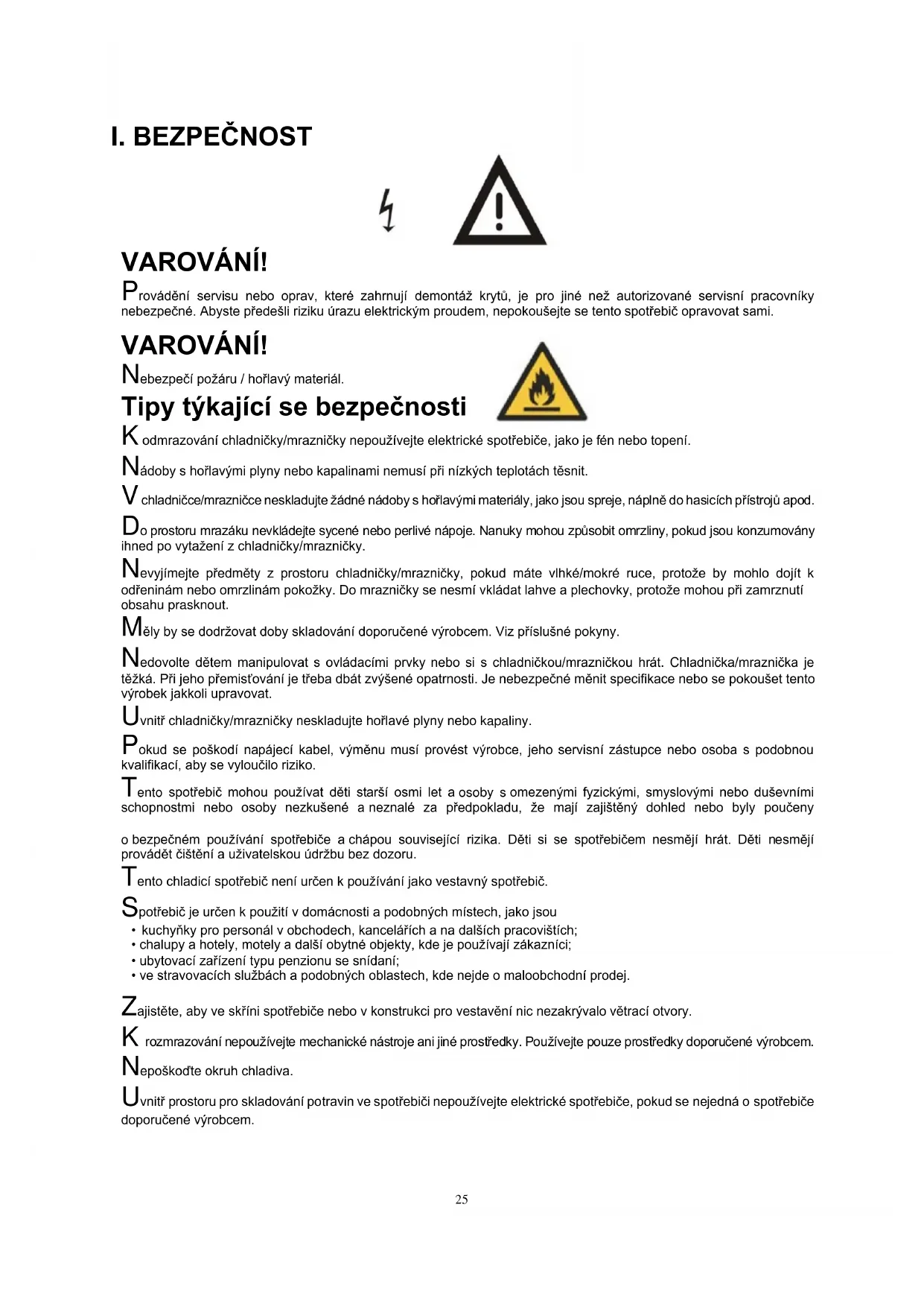 VAROVÁNÍ! Provádění servisu nebo oprav, které zahrnují demontáž krytů, je pro jiné než autorizované servisní pracovníky nebezpečné. Abyste předešli riziku úrazu elektrickým proudem, nepokoušejte se tento spotřebič opravovat sami. VAROVÁNÍ! Nebezpečí požáru / hořlavý materiál. Tipy týkající se bezpečnosti K odmrazování chladničky/mrazničky nepoužívejte elektrické spotřebiče, jako je fén nebo topení. Nádoby s hořlavými plyny nebo kapalinami nemusí při nízkých teplotách těsnit. V chladničce/mrazničce neskladujte žádné nádoby s hořlavými materiály, jako jsou spreje, náplně do hasicích přístrojů apod. Do prostoru mrazáku nevkládejte sycené nebo perlivé nápoje. Nanuky mohou způsobit omrzliny, pokud jsou konzumovány ihned po vytažení z chladničky/mrazničky. Nevyjímejte předměty z prostoru chladničky/mrazničky, pokud máte vlhké/mokré ruce, protože by mohlo dojít k odřeninám nebo omrzlinám pokožky. Do mrazničky se nesmí vkládat lahve a plechovky, protože mohou při zamrznutí obsahu prasknout. Měly by se dodržovat doby skladování doporučené výrobcem. Viz příslušné pokyny. Nedovolte dětem manipulovat s ovládacími prvky nebo si s chladničkou/mrazničkou hrát. Chladnička/mraznička je těžká. Při jeho přemisťování je třeba dbát zvýšené opatrnosti. Je nebezpečné měnit specifikace nebo se pokoušet tento výrobek jakkoli upravovat. Uvnitř chladničky/mrazničky neskladujte hořlavé plyny nebo kapaliny. Pokud se poškodí napájecí kabel, výměnu musí provést výrobce, jeho servisní zástupce nebo osoba s podobnou kvalifikací, aby se vyloučilo riziko. Tento spotřebič mohou používat děti starší osmi let a osoby s omezenými fyzickými, smyslovými nebo duševními schopnostmi nebo osoby nezkušené a neznalé za předpokladu, že mají zajištěný dohled nebo byly poučeny o bezpečném používání spotřebiče a chápou související rizika. Děti si se spotřebičem nesmějí hrát. Děti nesmějí provádět čištění a uživatelskou údržbu bez dozoru. Tento chladicí spotřebič není určen k používání jako vestavný spotřebič. Spotřebič je určen k použití v domácnosti a podobných místech, jako jsou