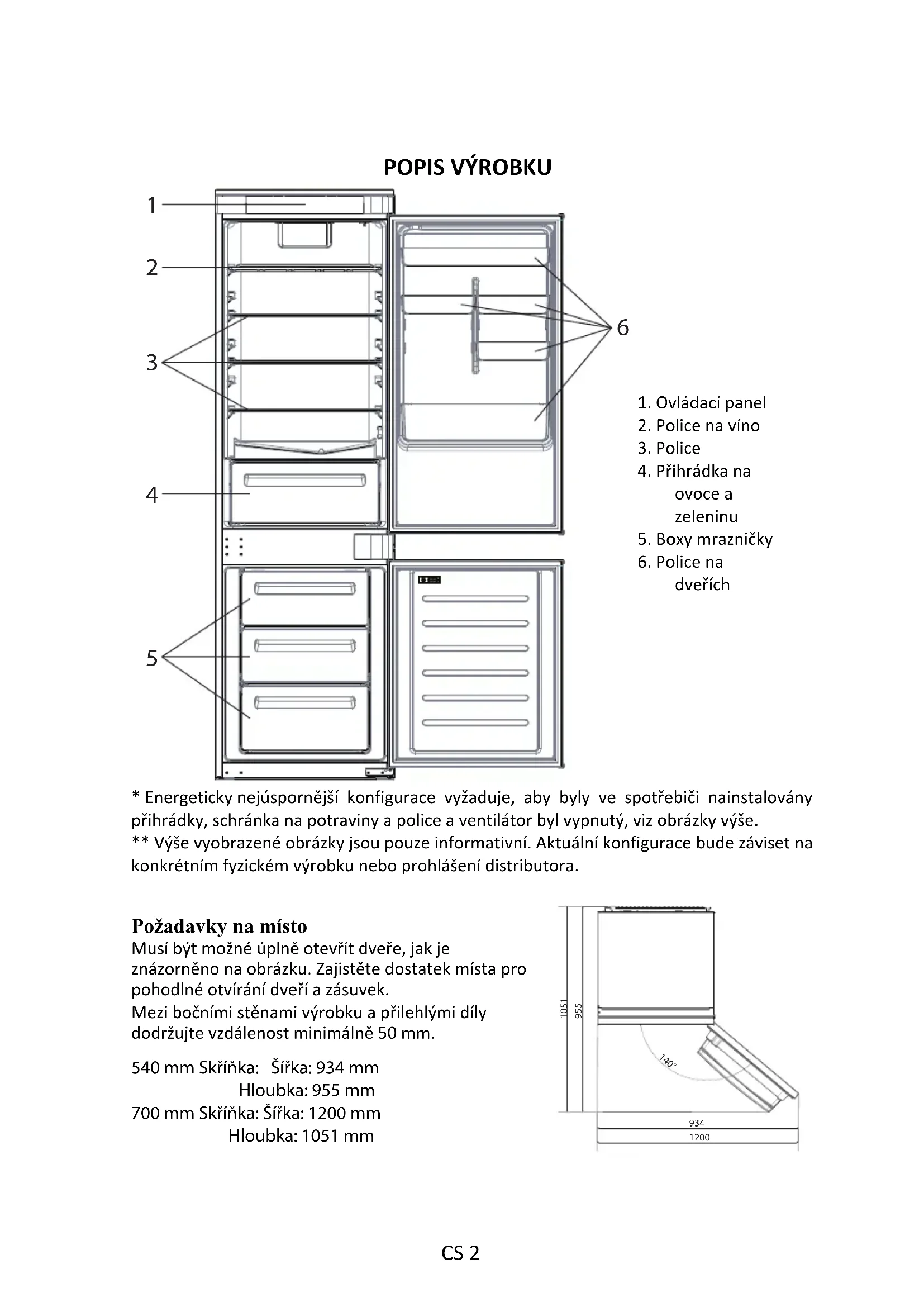 - Energeticky nejúspornější konfigurace vyžaduje, aby byly ve spotřebiči nainstalovány přihrádky, schránka na potraviny a police a ventilátor byl vypnutý, viz obrázky výše. ** Výše vyobrazené obrázky jsou pouze informativní. Aktuální konfigurace bude záviset na konkrétním fyzickém výrobku nebo prohlášení distributora. Požadavky na místo Musí být možné úplně otevřít dveře, jak je znázorněno na obrázku. Zajistěte dostatek místa pro pohodlné otvírání dveří a zásuvek. Mezi bočními stěnami výrobku a přilehlými díly dodržujte vzdálenost minimálně 50 mm.