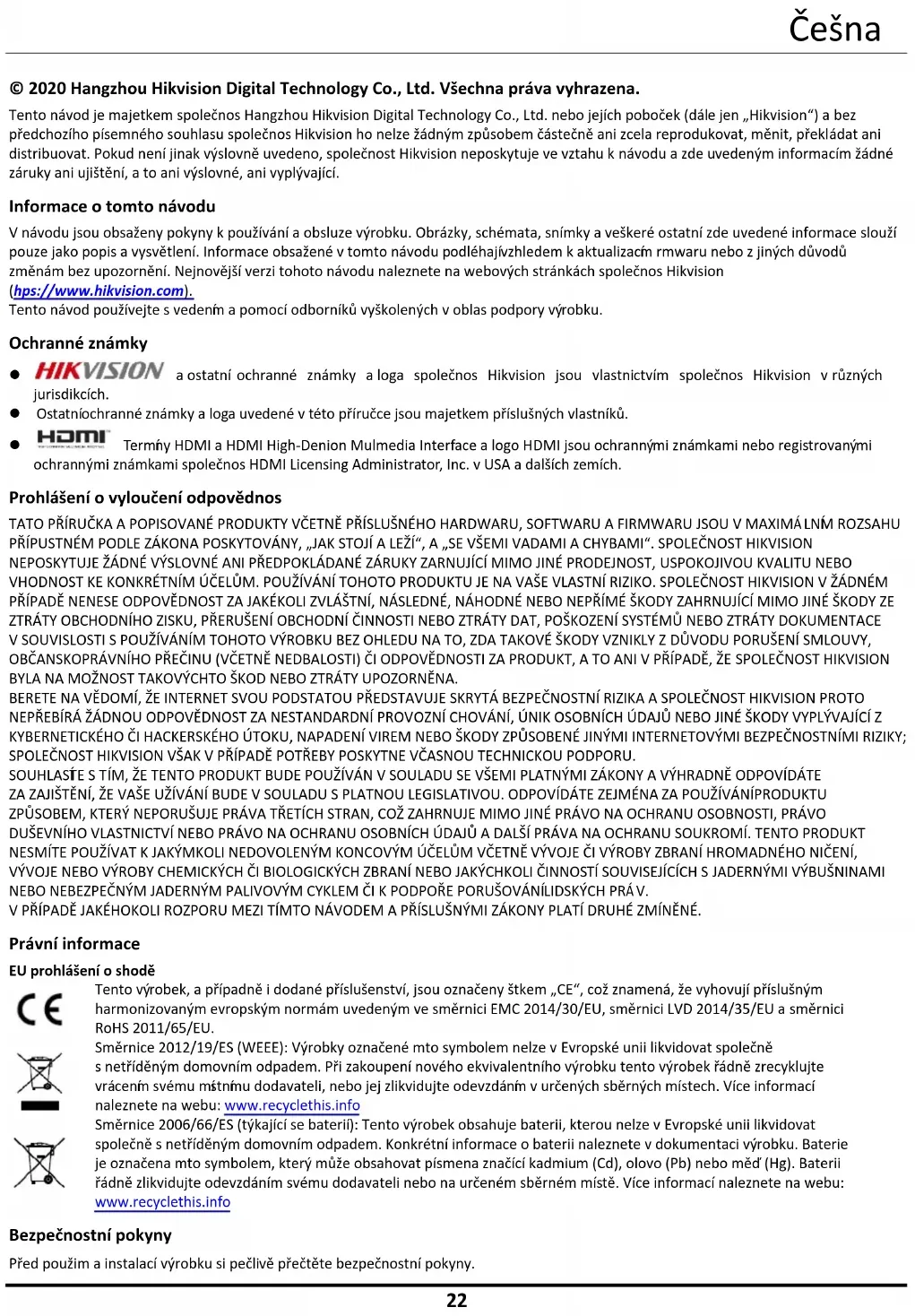 © 2020 Hangzhou Hikvision Digital Technology Co., Ltd. Všechna práva vyhrazena. Tento návod je majetkem společnosti Hangzhou Hikvision Digital Technology Co., Ltd. nebo jejích poboček (dále jen „Hikvision“) a bez předchozího písemného souhlasu společnosti Hikvision ho nelze žádným způsobem částečně ani zcela reprodukovat, měnit, překládat ani distribuovat. Pokud není jinak výslovně uvedeno, společnost Hikvision neposkytuje ve vztahu k návodu a zde uvedeným informacím žádné záruky ani ujištění, a to ani výslovné, ani vyplývající. Informace o tomto návodu V návodu jsou obsaženy pokyny k používání a obsluze výrobku. Obrázky, schémata, snímky a veškeré ostatní zde uvedené informace slouží pouze jako popis a vysvětlení. Informace obsažené v tomto návodu podléhají vzhledem k aktualizacím firmwaru nebo z jiných důvodů změnám bez upozornění. Nejnovější verzi tohoto návodu naleznete na webových stránkách společnosti Hikvision (https://www.hikvision.com). Tento návod používejte s vedením a pomocí odborníků vyškolených v oblasti podpory výrobku. Ochranné známky a ostatní ochranné známky a loga společnosti Hikvision jsou vlastnictvím společnosti Hikvision v různých jurisdikcích. Ostatní ochranné známky a loga uvedené v této příručce jsou majetkem příslušných vlastníků. Termíny HDMI a HDMI High-Definition Multimedia Interface a logo HDMI jsou ochrannými známkami nebo registrovanými ochrannými známkami společnosti HDMI Licensing Administrator, Inc. v USA a dalších zemích. Prohlášení o vyloučení odpovědnosti TATO PŘÍRUČKA A POPISOVANÉ PRODUKTY VČETNĚ PŘÍSLUŠNÉHO HARDWARU, SOFTWARU A FIRMWARU JSOU V MAXIMÁLNÍM ROZSAHU PŘÍPUSTNÉM PODLE ZÁKONA POSKYTOVÁNY, „JAK STOJÍ A LEŽÍ“, A „SE VŠEMI VADAMI A CHYBAMI“. SPOLEČNOST HIKVISION NEPOSKYTUJE ŽÁDNÉ VÝSLOVNÉ ANI PŘEDPOKLÁDANÉ ZÁRUKY ZARNUJÍCÍ MIMO JINÉ PRODEJNOST, USPOKOJIVOU KVALITU NEBO VHODNOST KE KONKRÉTNÍM ÚČELŮM. POUŽÍVÁNÍ TOHOTO PRODUKTU JE NA VAŠE VLASTNÍ RIZIKO. SPOLEČNOST HIKVISION V ŽÁDNÉM PŘÍPADĚ NENESE ODPOVĚDNOST ZA JAKÉKOLI ZVLÁŠTNÍ, NÁSLEDNÉ, NÁHODNÉ NEBO NEPŘÍMÉ ŠKODY ZAHRNUJÍCÍ MIMO JINÉ ŠKODY ZE ZTRÁTY OBCHODNÍHO ZISKU, PŘERUŠENÍ OBCHODNÍ ČINNOSTI NEBO ZTRÁTY DAT, POŠKOZENÍ SYSTÉMŮ NEBO ZTRÁTY DOKUMENTACE V SOUVISLOSTI S POUŽÍVÁNÍM TOHOTO VÝROBKU BEZ OHLEDU NA TO, ZDA TAKOVÉ ŠKODY VZNIKLY Z DŮVODU PORUŠENÍ SMLOUVY, OBČANSKOPRÁVNÍHO PŘEČINU (VČETNĚ NEDBALOSTI) ČI ODPOVĚDNOSTI ZA PRODUKT, A TO ANI V PŘÍPADĚ, ŽE SPOLEČNOST HIKVISION BYLA NA MOŽNOST TAKOVÝCHTO ŠKOD NEBO ZTRÁTY UPOZORNĚNA. BERETE NA VĚDOMÍ, ŽE INTERNET SVOU PODSTATOU PŘEDSTAVUJE SKRYTÁ BEZPEČNOSTNÍ RIZIKA A SPOLEČNOST HIKVISION PROTO NEPŘEBÍRÁ ŽÁDNOU ODPOVĚDNOST ZA NESTANDARDNÍ PROVOZNÍ CHOVÁNÍ, ÚNIK OSOBNÍCH ÚDAJŮ NEBO JINÉ ŠKODY VYPLÝVAJÍCÍ Z KYBERNETICKÉHO ČI HACKERSKÉHO ÚTOKU, NAPADENÍ VIREM NEBO ŠKODY ZPŮSOBENÉ JINÝMI INTERNETOVÝMI BEZPEČNOSTNÍMI RIZIKY; SPOLEČNOST HIKVISION VŠAK V PŘÍPADĚ POTŘEBY POSKYTNE VČASNOU TECHNICKOU PODPORU. SOUHLASÍTE S TÍM, ŽE TENTO PRODUKT BUDE POUŽÍVÁN V SOULADU SE VŠEMI PLATNÝMI ZÁKONY A VÝHRADNĚ ODPOVÍDÁTE ZA ZAJIŠTĚNÍ, ŽE VAŠE UŽÍVÁNÍ BUDE V SOULADU S PLATNOU LEGISLATIVOU. ODPOVÍDÁTE ZEJMÉNA ZA POUŽÍVÁNÍ PRODUKTU ZPŮSOBEM, KTERÝ NEPORUŠUJE PRÁVA TŘETÍCH STRAN, COŽ ZAHRNUJE MIMO JINÉ PRÁVO NA OCHRANU OSOBNOSTI, PRÁVO DUŠEVNÍHO VLASTNICTVÍ NEBO PRÁVO NA OCHRANU OSOBNÍCH ÚDAJŮ A DALŠÍ PRÁVA NA OCHRANU SOUKROMÍ. TENTO PRODUKT NESMÍTE POUŽÍVAT K JAKÝMKOLI NEDOVOLENÝM KONCOVÝM ÚČELŮM VČETNĚ VÝVOJE ČI VÝROBY ZBRANÍ HROMADNÉHO NIČENÍ, VÝVOJE NEBO VÝROBY CHEMICKÝCH ČI BIOLOGICKÝCH ZBRANÍ NEBO JAKÝCHKOLI ČINNOSTÍ SOUVISEJÍCÍCH S JADERNÝMI VÝBUŠNINAMI NEBO NEBEZPEČNÝM JADERNÝM PALIVOVÝM CYKLEM ČI K PODPOŘE PORUŠOVÁNÍ LIDSKÝCH PRÁV. V PŘÍPADĚ JAKÉHOKOLI ROZPORU MEZI TÍMTO NÁVODEM A PŘÍSLUŠNÝMI ZÁKONY PLATÍ DRUHÉ ZMÍNĚNÉ. Právní informace EU prohlášení o shodě