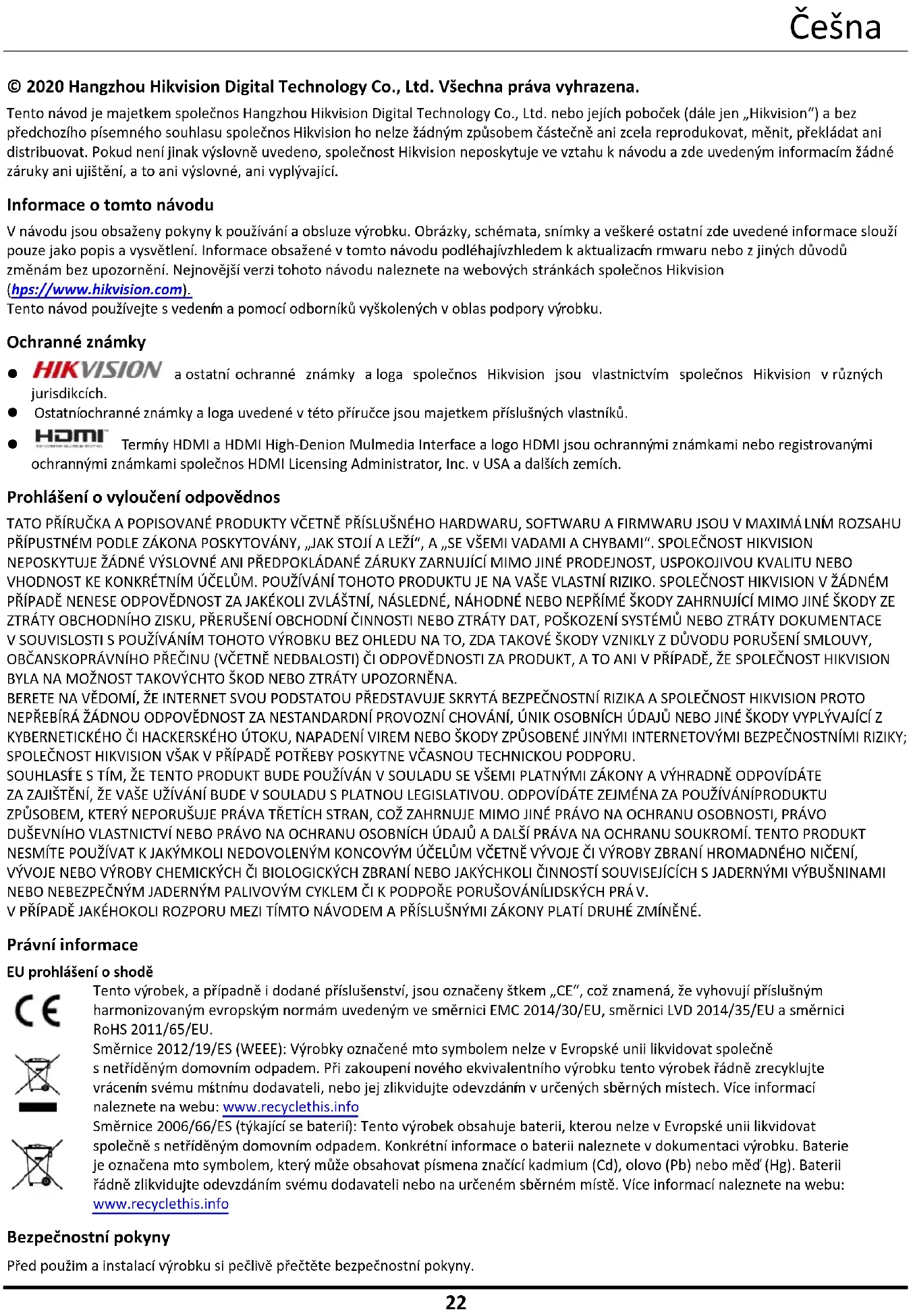 © 2020 Hangzhou Hikvision Digital Technology Co., Ltd. Všechna práva vyhrazena. Tento návod je majetkem společnosti Hangzhou Hikvision Digital Technology Co., Ltd. nebo jejích poboček (dále jen „Hikvision“) a bez předchozího písemného souhlasu společnosti Hikvision ho nelze žádným způsobem částečně ani zcela reprodukovat, měnit, překládat ani distribuovat. Pokud není jinak výslovně uvedeno, společnost Hikvision neposkytuje ve vztahu k návodu a zde uvedeným informacím žádné záruky ani ujištění, a to ani výslovné, ani vyplývající. Informace o tomto návodu V návodu jsou obsaženy pokyny k používání a obsluze výrobku. Obrázky, schémata, snímky a veškeré ostatní zde uvedené informace slouží pouze jako popis a vysvětlení. Informace obsažené v tomto návodu podléhají vzhledem k aktualizacím firmwaru nebo z jiných důvodů změnám bez upozornění. Nejnovější verzi tohoto návodu naleznete na webových stránkách společnosti Hikvision (https://www.hikvision.com). Tento návod používejte s vedením a pomocí odborníků vyškolených v oblasti podpory výrobku. Ochranné známky a ostatní ochranné známky a loga společnosti Hikvision jsou vlastnictvím společnosti Hikvision v různých jurisdikcích. Ostatní ochranné známky a loga uvedené v této příručce jsou majetkem příslušných vlastníků. Termíny HDMI a HDMI High-Definition Multimedia Interface a logo HDMI jsou ochrannými známkami nebo registrovanými ochrannými známkami společnosti HDMI Licensing Administrator, Inc. v USA a dalších zemích. Prohlášení o vyloučení odpovědnosti TATO PŘÍRUČKA A POPISOVANÉ PRODUKTY VČETNĚ PŘÍSLUŠNÉHO HARDWARU, SOFTWARU A FIRMWARU JSOU V MAXIMÁLNÍM ROZSAHU PŘÍPUSTNÉM PODLE ZÁKONA POSKYTOVÁNY, „JAK STOJÍ A LEŽÍ“, A „SE VŠEMI VADAMI A CHYBAMI“. SPOLEČNOST HIKVISION NEPOSKYTUJE ŽÁDNÉ VÝSLOVNÉ ANI PŘEDPOKLÁDANÉ ZÁRUKY ZARNUJÍCÍ MIMO JINÉ PRODEJNOST, USPOKOJIVOU KVALITU NEBO VHODNOST KE KONKRÉTNÍM ÚČELŮM. POUŽÍVÁNÍ TOHOTO PRODUKTU JE NA VAŠE VLASTNÍ RIZIKO. SPOLEČNOST HIKVISION V ŽÁDNÉM PŘÍPADĚ NENESE ODPOVĚDNOST ZA JAKÉKOLI ZVLÁŠTNÍ, NÁSLEDNÉ, NÁHODNÉ NEBO NEPŘÍMÉ ŠKODY ZAHRNUJÍCÍ MIMO JINÉ ŠKODY ZE ZTRÁTY OBCHODNÍHO ZISKU, PŘERUŠENÍ OBCHODNÍ ČINNOSTI NEBO ZTRÁTY DAT, POŠKOZENÍ SYSTÉMŮ NEBO ZTRÁTY DOKUMENTACE V SOUVISLOSTI S POUŽÍVÁNÍM TOHOTO VÝROBKU BEZ OHLEDU NA TO, ZDA TAKOVÉ ŠKODY VZNIKLY Z DŮVODU PORUŠENÍ SMLOUVY, OBČANSKOPRÁVNÍHO PŘEČINU (VČETNĚ NEDBALOSTI) ČI ODPOVĚDNOSTI ZA PRODUKT, A TO ANI V PŘÍPADĚ, ŽE SPOLEČNOST HIKVISION BYLA NA MOŽNOST TAKOVÝCHTO ŠKOD NEBO ZTRÁTY UPOZORNĚNA. BERETE NA VĚDOMÍ, ŽE INTERNET SVOU PODSTATOU PŘEDSTAVUJE SKRYTÁ BEZPEČNOSTNÍ RIZIKA A SPOLEČNOST HIKVISION PROTO NEPŘEBÍRÁ ŽÁDNOU ODPOVĚDNOST ZA NESTANDARDNÍ PROVOZNÍ CHOVÁNÍ, ÚNIK OSOBNÍCH ÚDAJŮ NEBO JINÉ ŠKODY VYPLÝVAJÍCÍ Z KYBERNETICKÉHO ČI HACKERSKÉHO ÚTOKU, NAPADENÍ VIREM NEBO ŠKODY ZPŮSOBENÉ JINÝMI INTERNETOVÝMI BEZPEČNOSTNÍMI RIZIKY; SPOLEČNOST HIKVISION VŠAK V PŘÍPADĚ POTŘEBY POSKYTNE VČASNOU TECHNICKOU PODPORU. SOUHLASÍTE S TÍM, ŽE TENTO PRODUKT BUDE POUŽÍVÁN V SOULADU SE VŠEMI PLATNÝMI ZÁKONY A VÝHRADNĚ ODPOVÍDÁTE ZA ZAJIŠTĚNÍ, ŽE VAŠE UŽÍVÁNÍ BUDE V SOULADU S PLATNOU LEGISLATIVOU. ODPOVÍDÁTE ZEJMÉNA ZA POUŽÍVÁNÍ PRODUKTU ZPŮSOBEM, KTERÝ NEPORUŠUJE PRÁVA TŘETÍCH STRAN, COŽ ZAHRNUJE MIMO JINÉ PRÁVO NA OCHRANU OSOBNOSTI, PRÁVO DUŠEVNÍHO VLASTNICTVÍ NEBO PRÁVO NA OCHRANU OSOBNÍCH ÚDAJŮ A DALŠÍ PRÁVA NA OCHRANU SOUKROMÍ. TENTO PRODUKT NESMÍTE POUŽÍVAT K JAKÝMKOLI NEDOVOLENÝM KONCOVÝM ÚČELŮM VČETNĚ VÝVOJE ČI VÝROBY ZBRANÍ HROMADNÉHO NIČENÍ, VÝVOJE NEBO VÝROBY CHEMICKÝCH ČI BIOLOGICKÝCH ZBRANÍ NEBO JAKÝCHKOLI ČINNOSTÍ SOUVISEJÍCÍCH S JADERNÝMI VÝBUŠNINAMI NEBO NEBEZPEČNÝM JADERNÝM PALIVOVÝM CYKLEM ČI K PODPOŘE PORUŠOVÁNÍ LIDSKÝCH PRÁV. V PŘÍPADĚ JAKÉHOKOLI ROZPORU MEZI TÍMTO NÁVODEM A PŘÍSLUŠNÝMI ZÁKONY PLATÍ DRUHÉ ZMÍNĚNÉ. Právní informace EU prohlášení o shodě