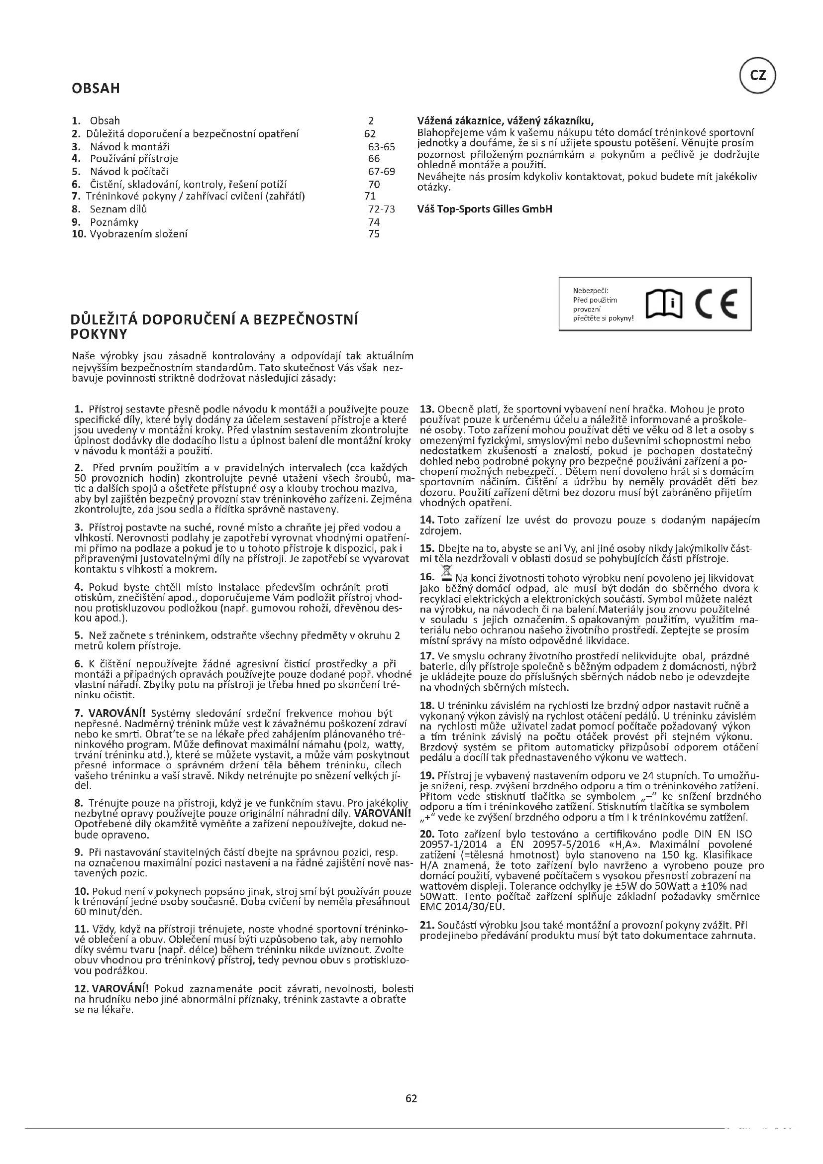 OBSAH DŮLEŽITÁ DOPORUČENÍ A BEZPEČNOSTNÍ POKYNY Vážená zákaznice, vážený zákazníku, Blahopřejeme vám k vašemu nákupu této domácí tréninkové sportovní jednotky a doufáme, že si s ní užijete spoustu potěšení. Věnujte prosím pozornost přiloženým poznámkám a pokynům a pečlivě je dodržujte ohledně montáže a použi. Neváhejte nás prosím kdykoliv kontaktovat, pokud budete mít jakékoliv otázky. Váš Top-Sports Gilles GmbH Naše výrobky jsou zásadně kontrolovány a odpovídají tak aktuálním nejvyšším bezpečnostním standardům. Tato skutečnost Vás však nez- bavuje povinnos striktně dodržovat následující zásady: