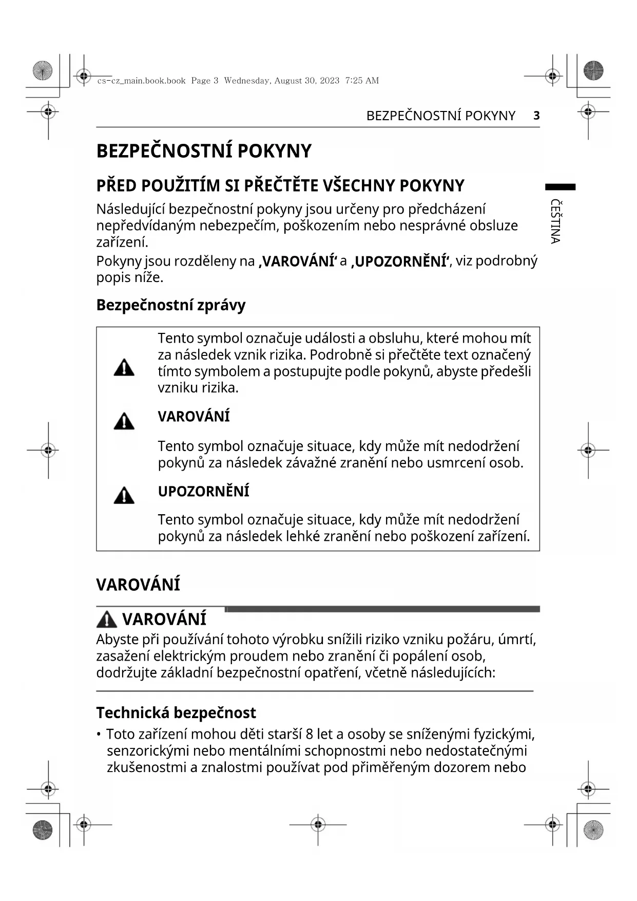 - Toto zařízení mohou děti starší 8 let a osoby se sníženými fyzickými, senzorickými nebo mentálními schopnostmi nebo nedostatečnými zkušenostmi a znalostmi používat pod přiměřeným dozorem nebo Tento symbol označuje události a obsluhu, které mohou mít za následek vznik rizika. Podrobně si přečtěte text označený tímto symbolem a postupujte podle pokynů, abyste předešli vzniku rizika. VAROVÁNÍ Tento symbol označuje situace, kdy může mít nedodržení pokynů za následek závažné zranění nebo usmrcení osob. UPOZORNĚNÍ Tento symbol označuje situace, kdy může mít nedodržení pokynů za následek lehké zranění nebo poškození zařízení. cs-cz_main.book.book Page 3 Wednesday, August 30, 2023 7:25 AM4